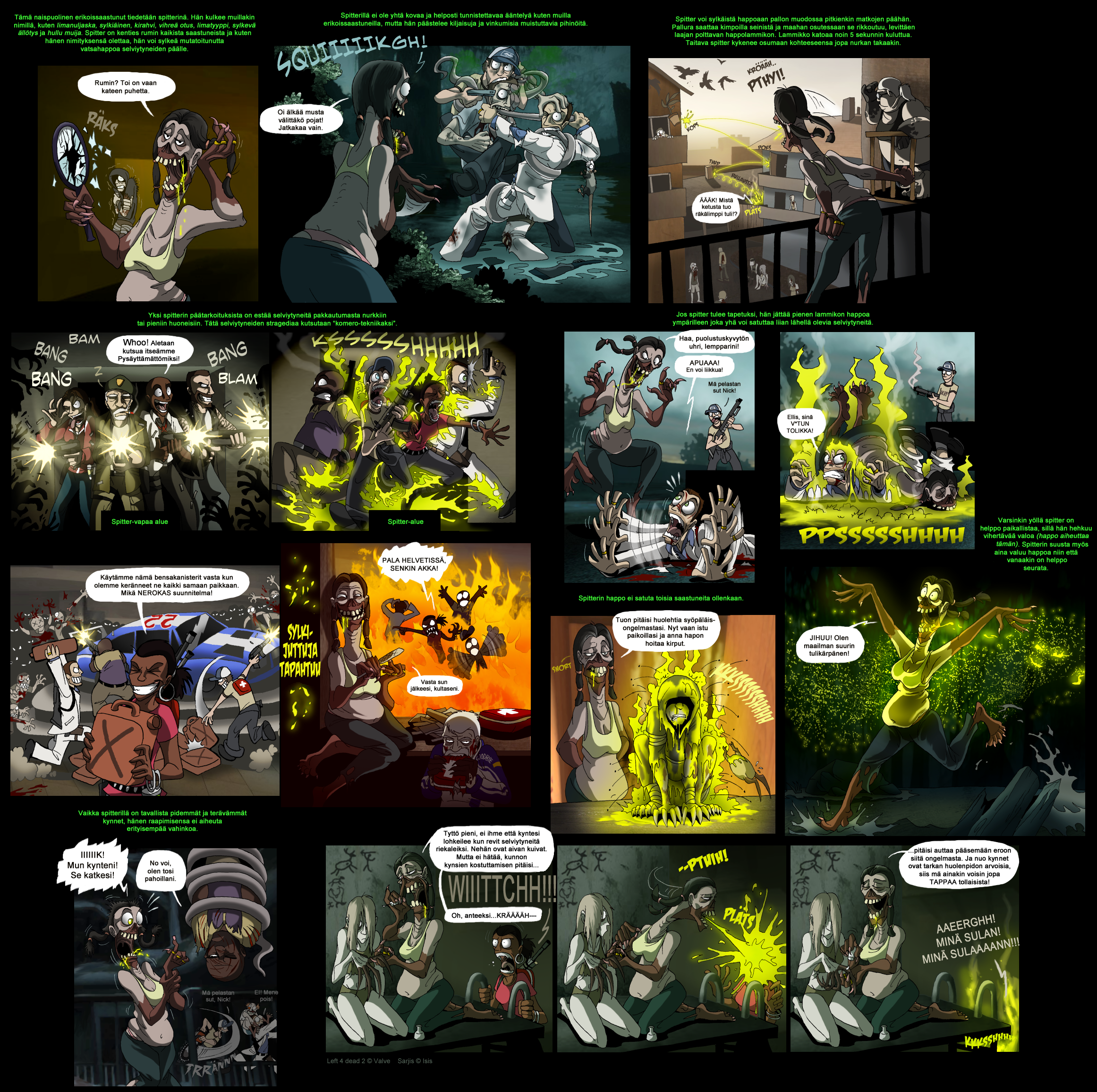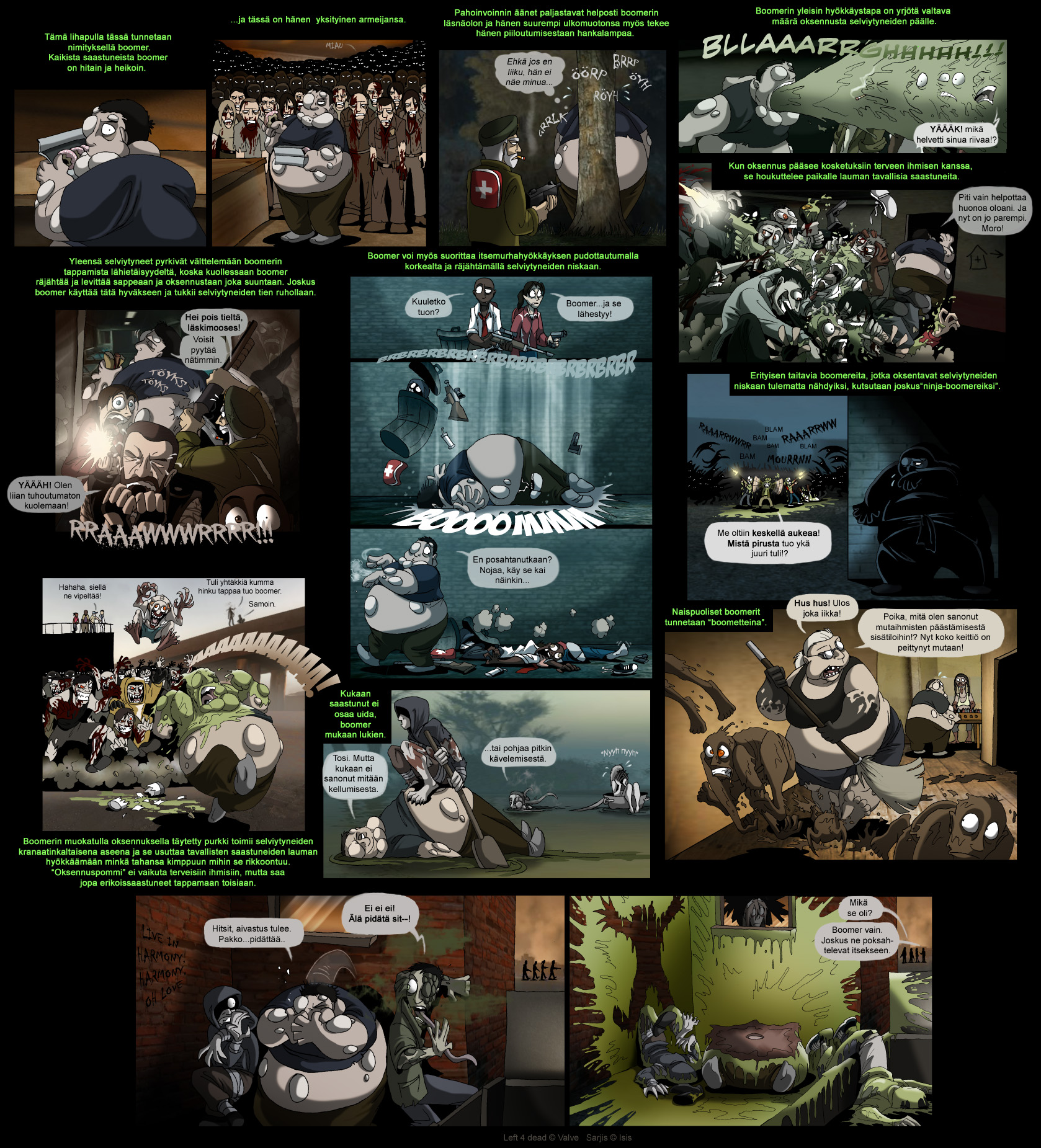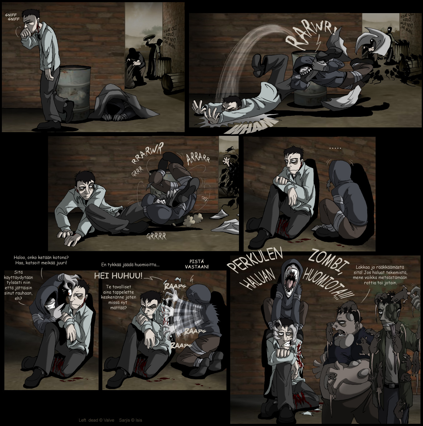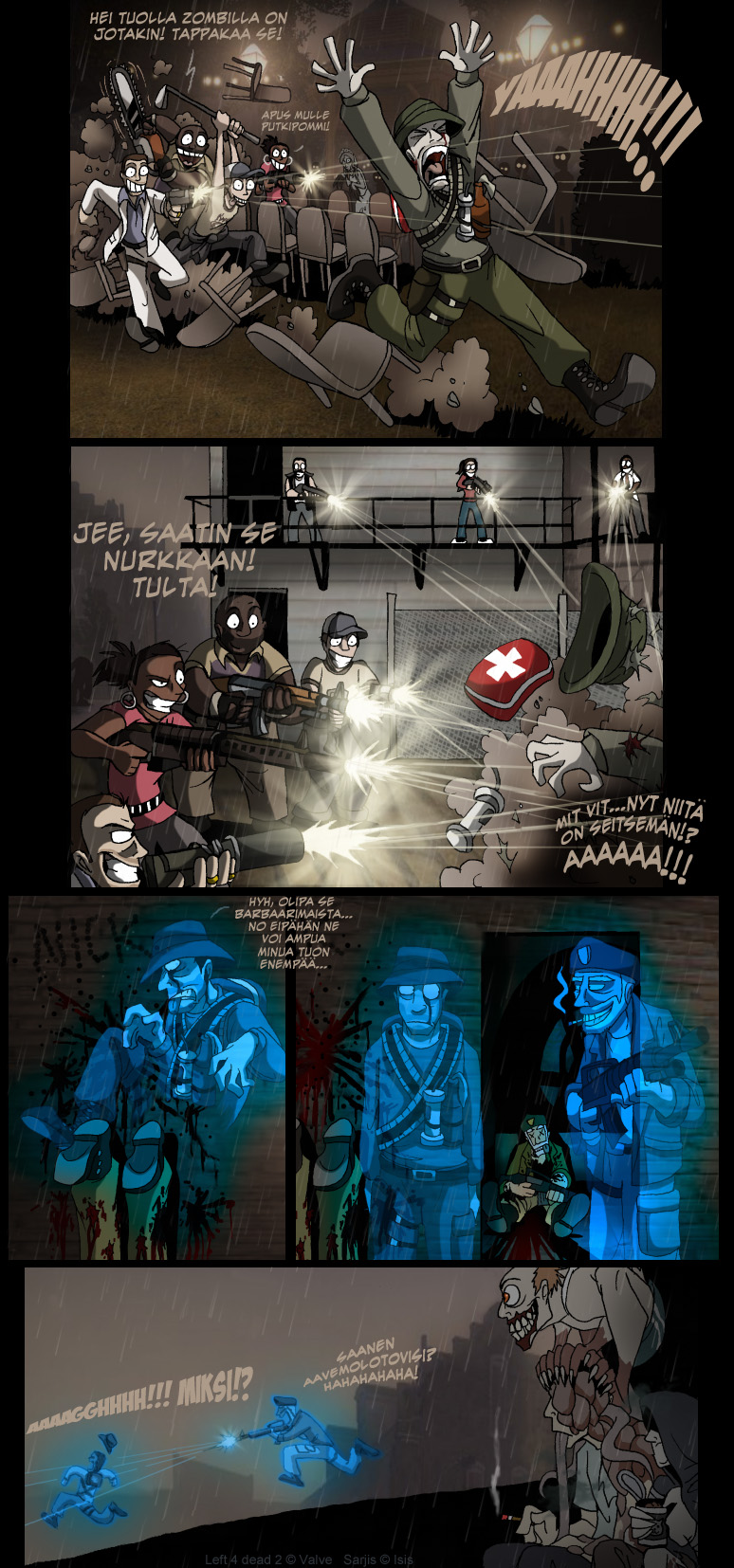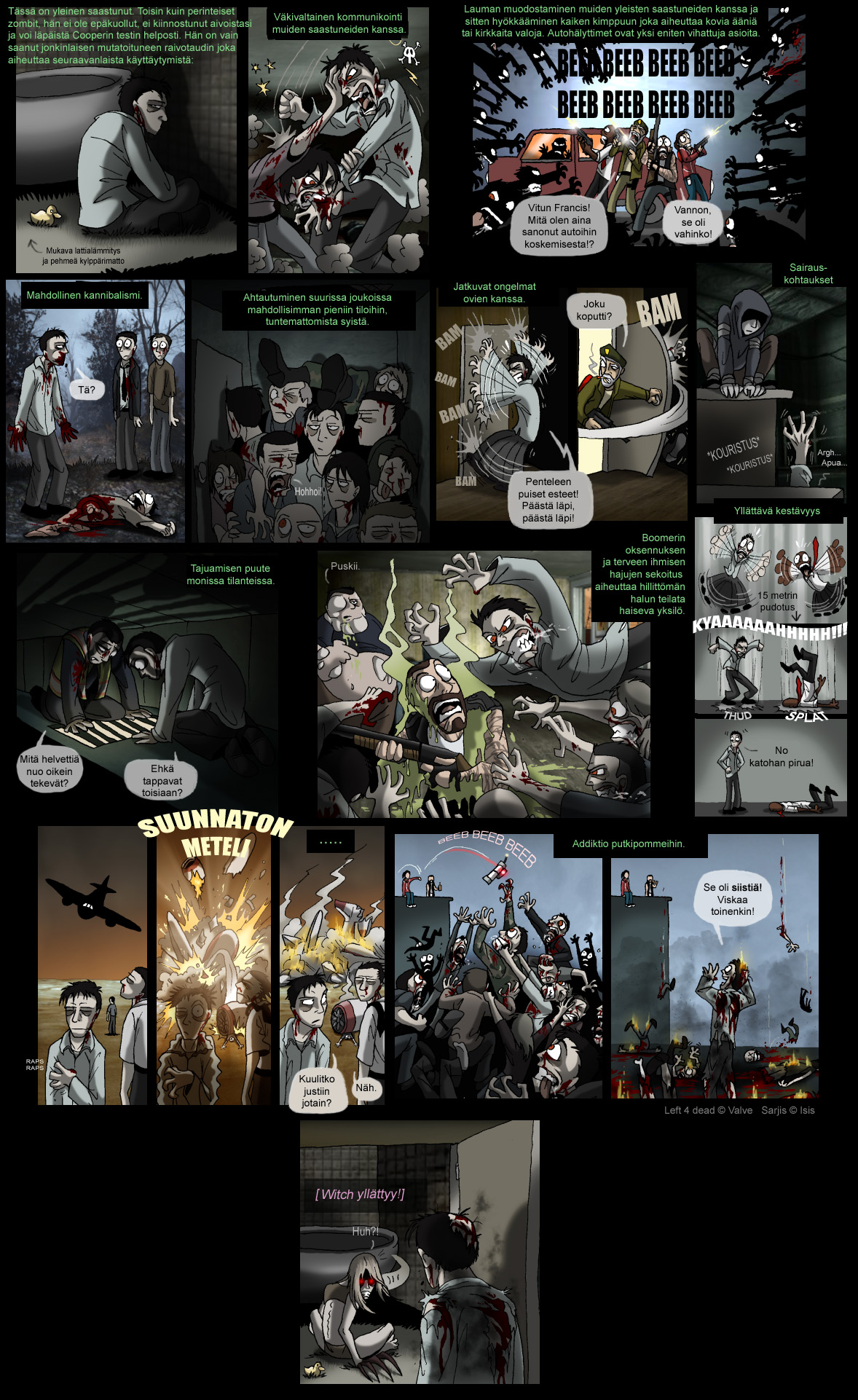 Näiden pilasarjakuvien aiheena on Valven julkaisema Left 4 Dead, ensimmäisen persoonan ammunta- ja selviytymiskauhupeli. Pelissä on 2 vastakkaista tiimiä, ihmis-selviytyjät ja zombimaiset saastuneet. Sarjakuvissa on paljon väkivaltaa ja kiroilua.