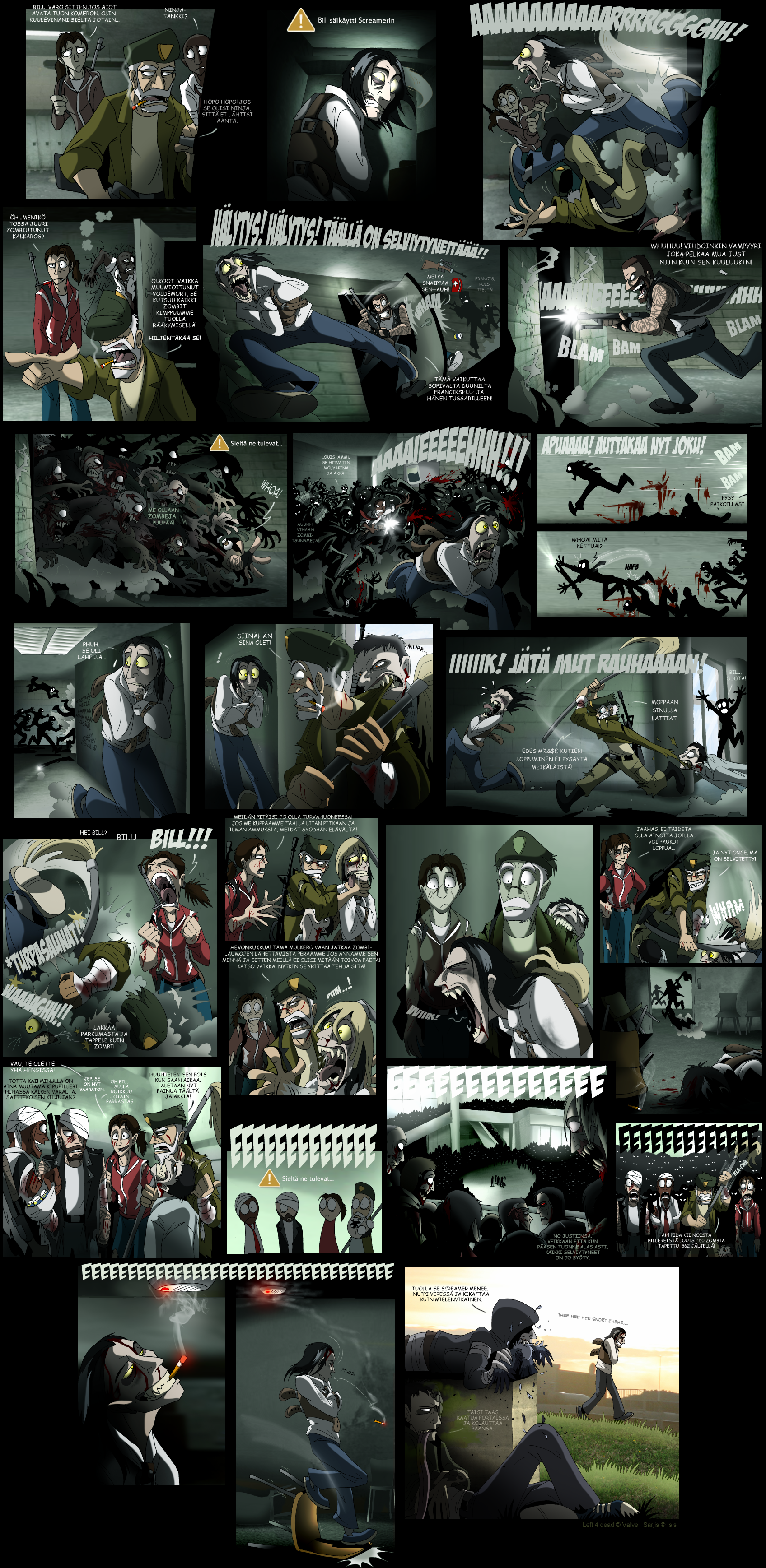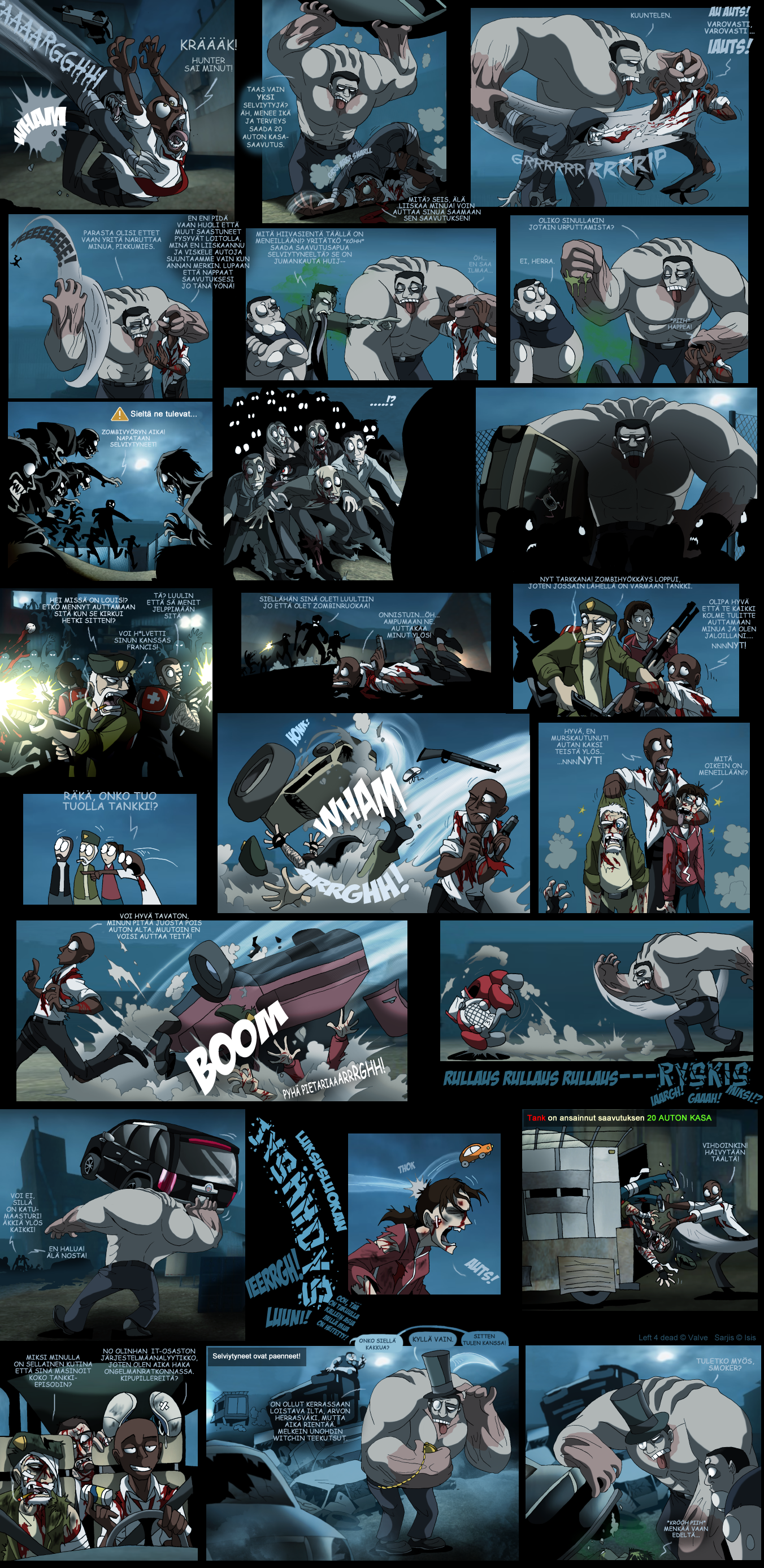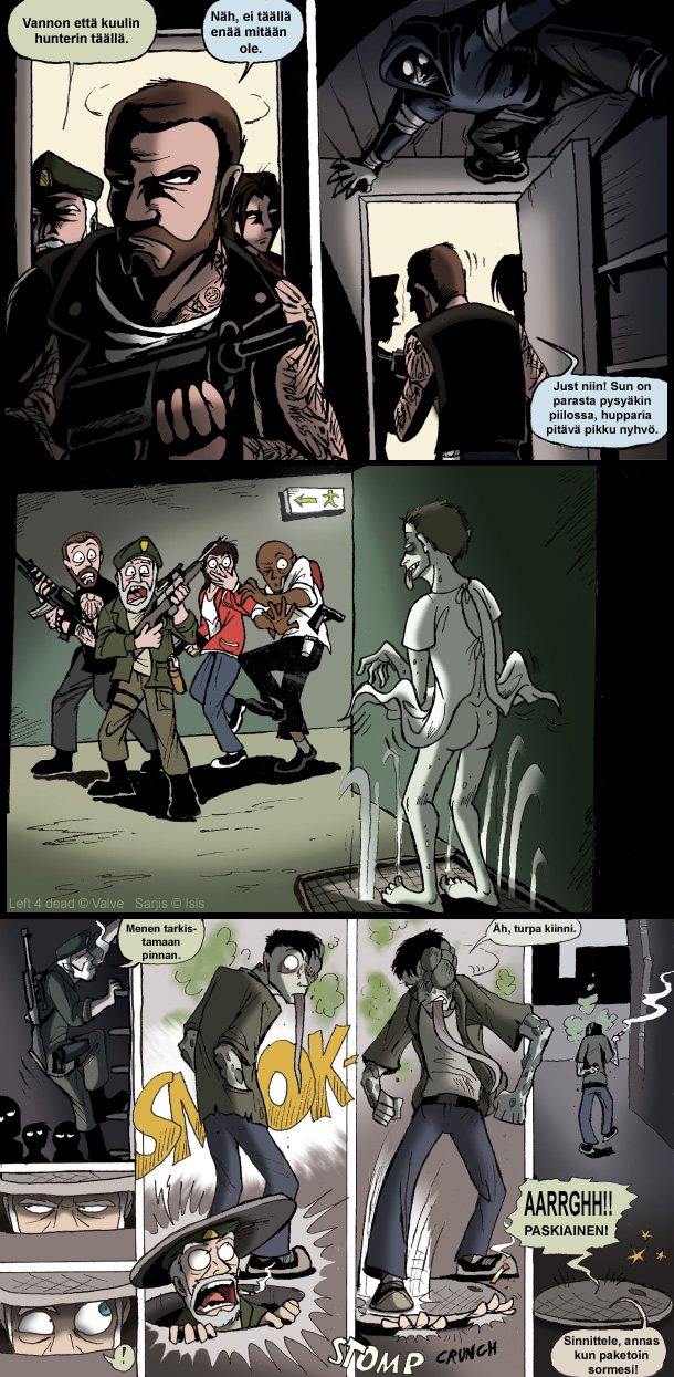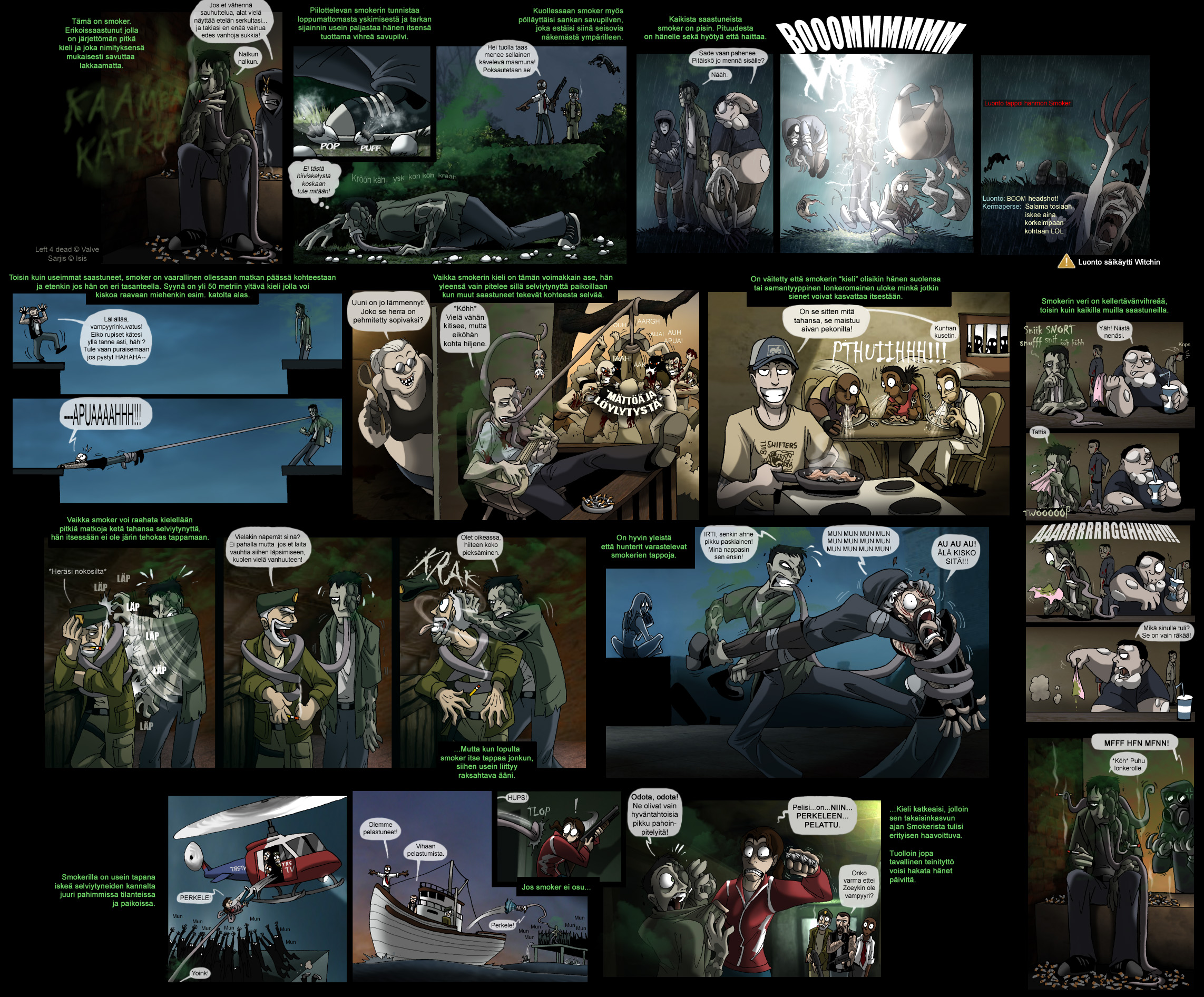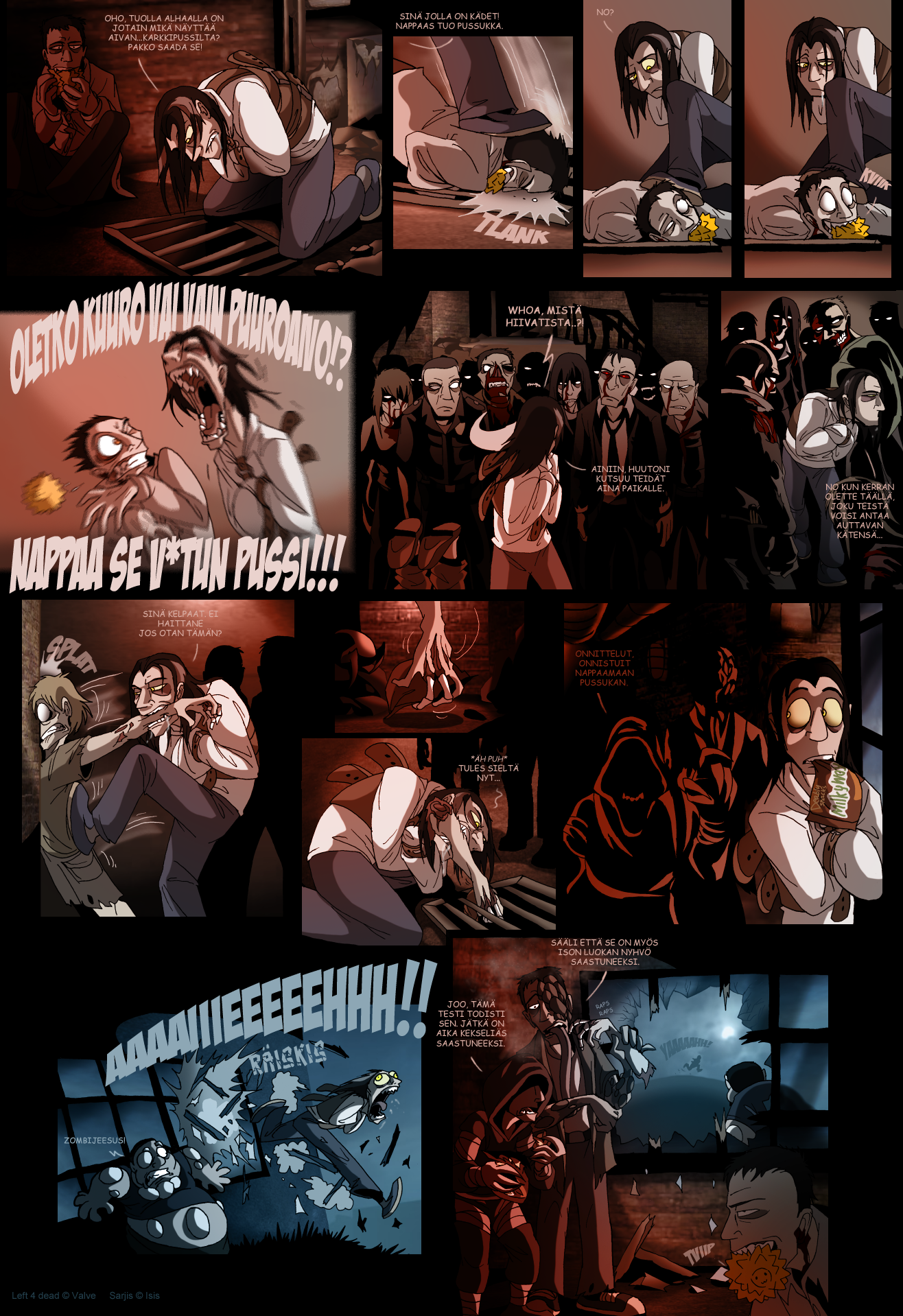Näiden pilasarjakuvien aiheena on Valven julkaisema Left 4 Dead, ensimmäisen persoonan ammunta- ja selviytymiskauhupeli. Pelissä on 2 vastakkaista tiimiä, ihmis-selviytyjät ja zombimaiset saastuneet. Sarjakuvissa on paljon väkivaltaa ja kiroilua.