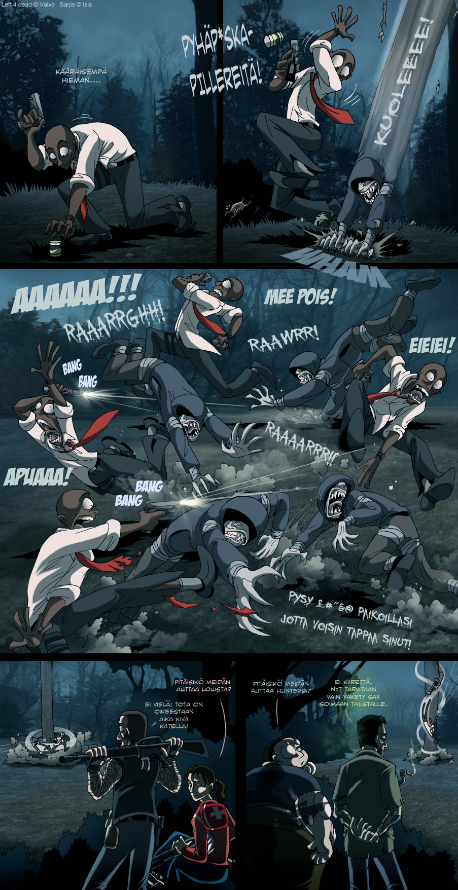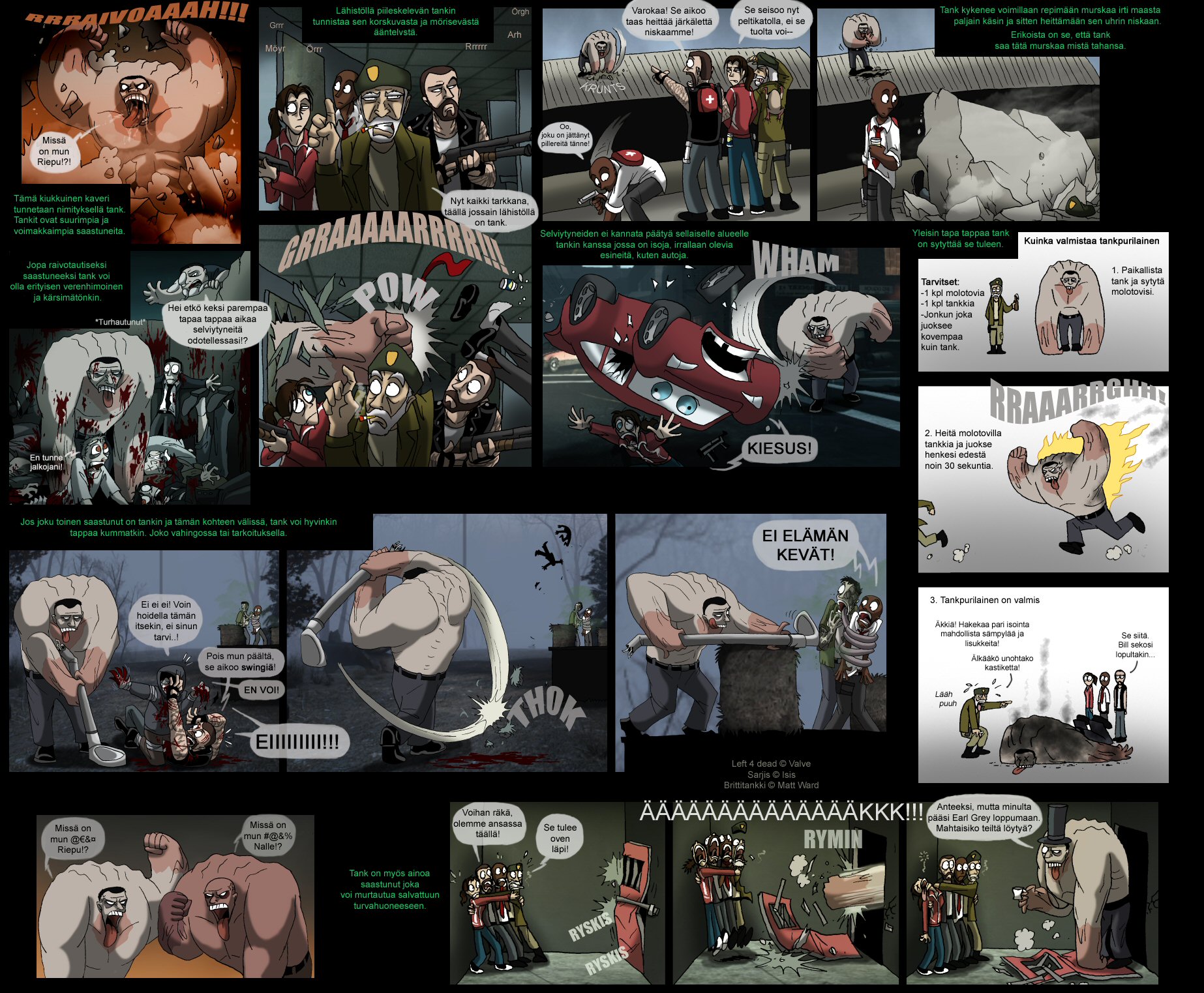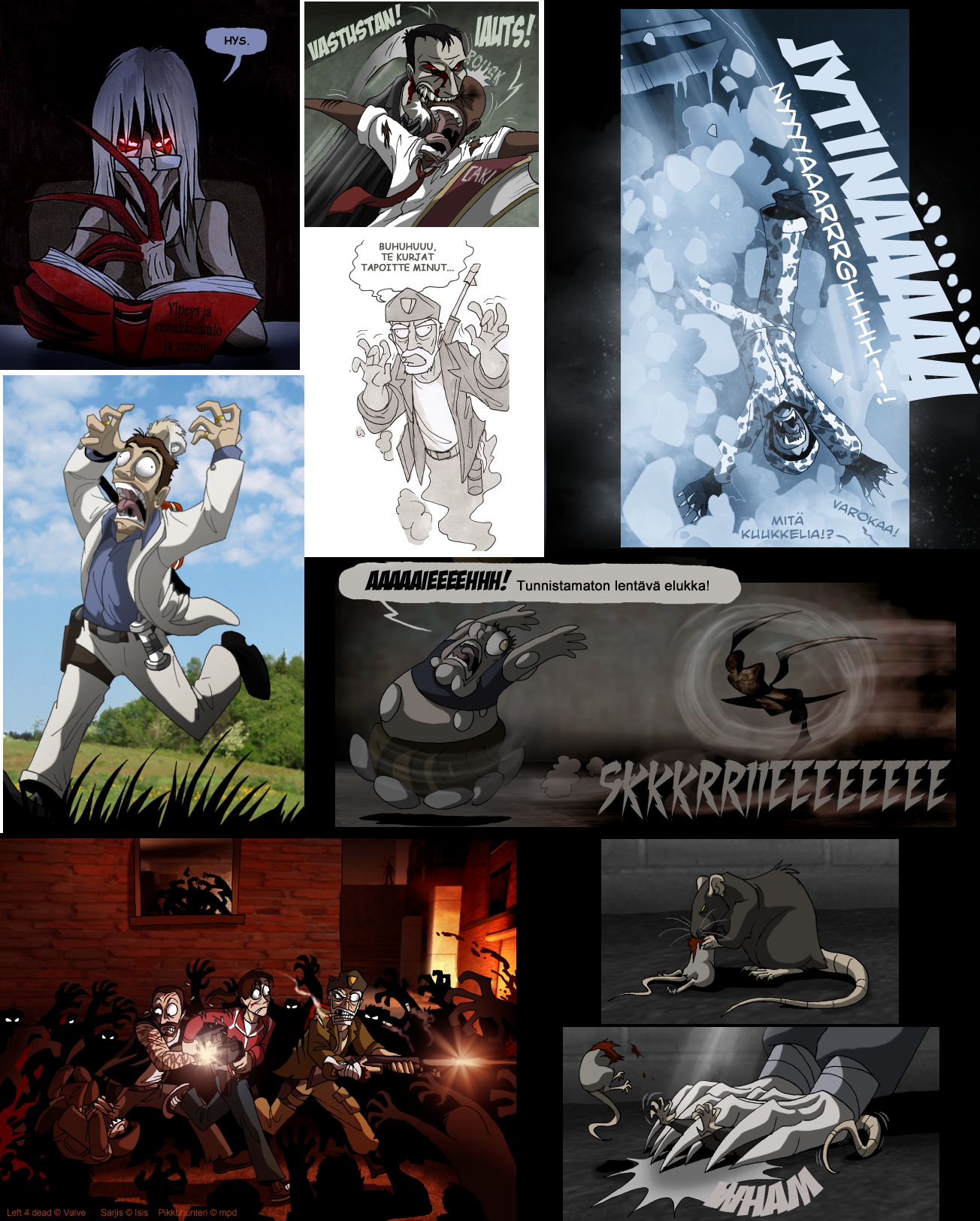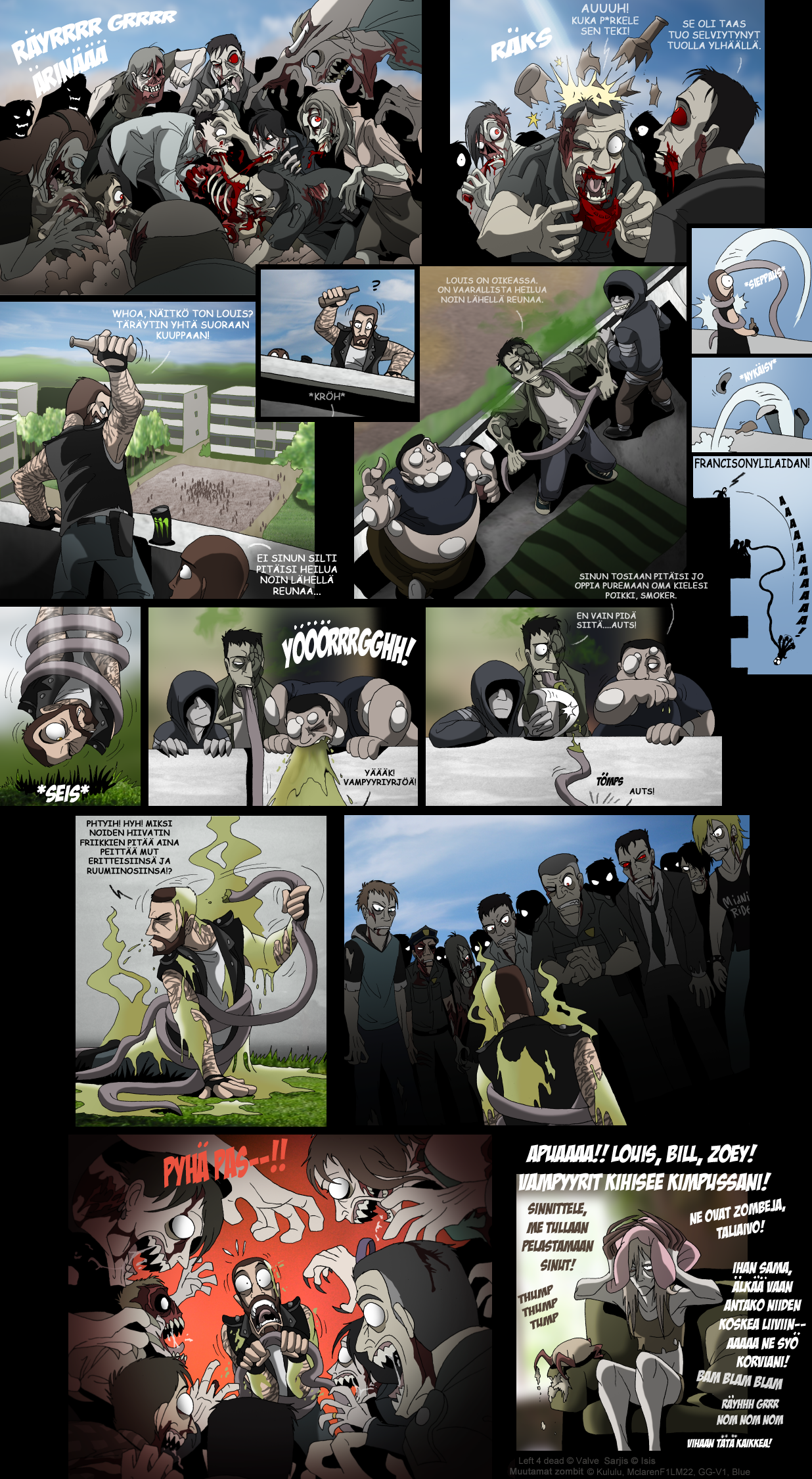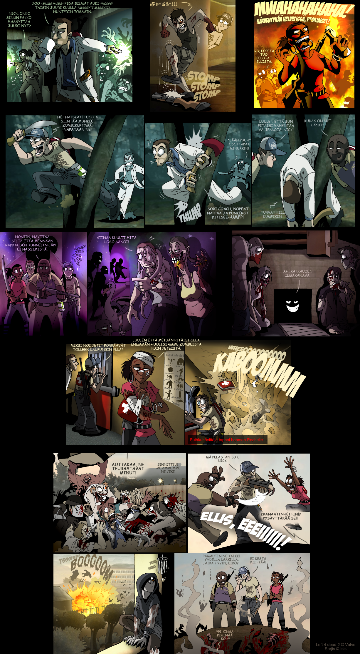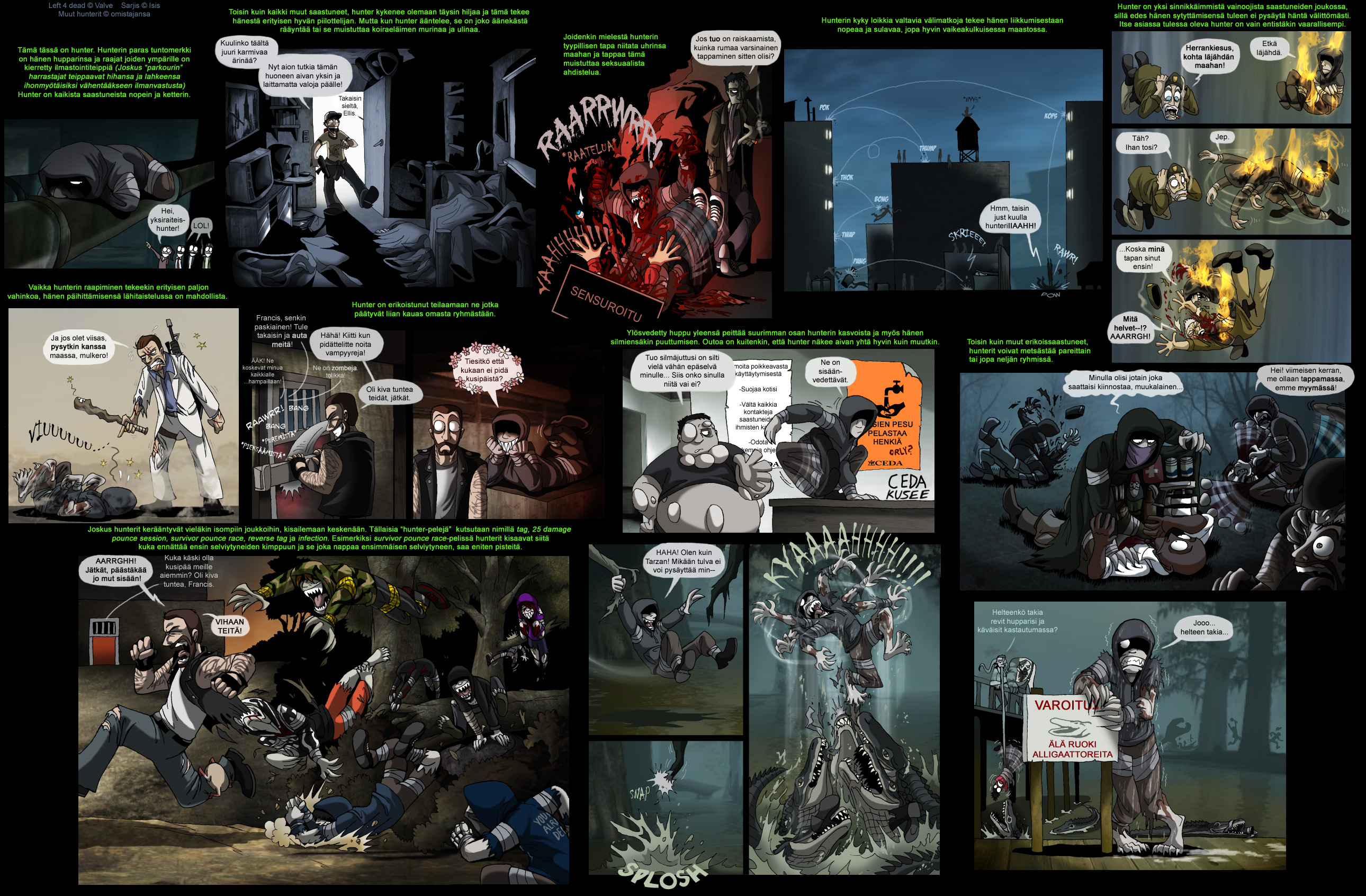 Näiden pilasarjakuvien aiheena on Valven julkaisema Left 4 Dead, ensimmäisen persoonan ammunta- ja selviytymiskauhupeli. Pelissä on 2 vastakkaista tiimiä, ihmis-selviytyjät ja zombimaiset saastuneet. Sarjakuvissa on paljon väkivaltaa ja kiroilua.