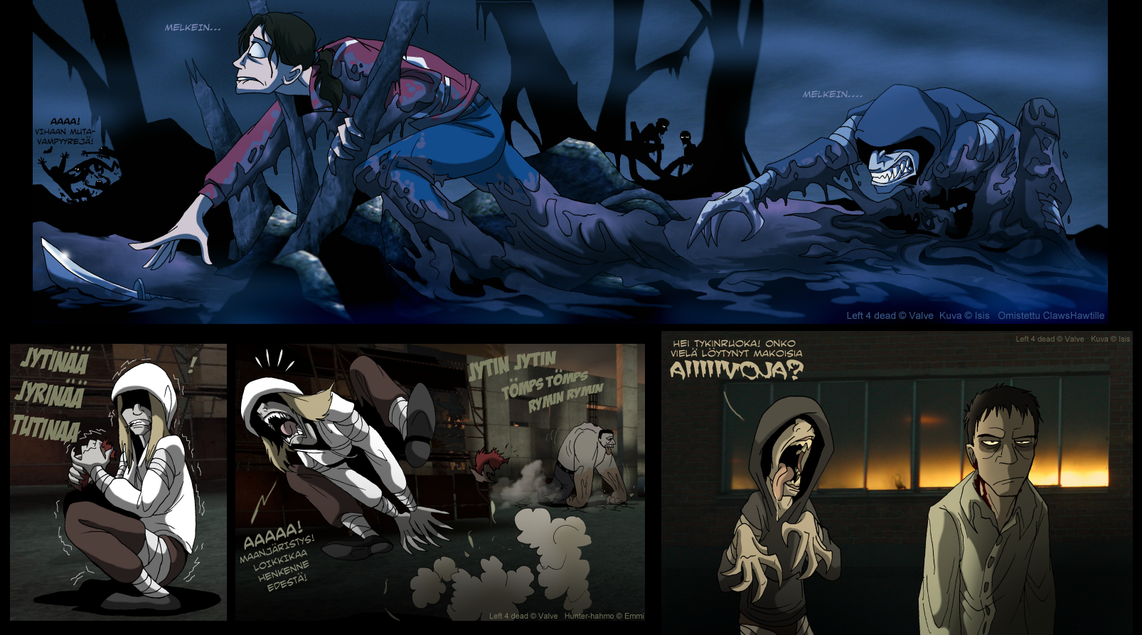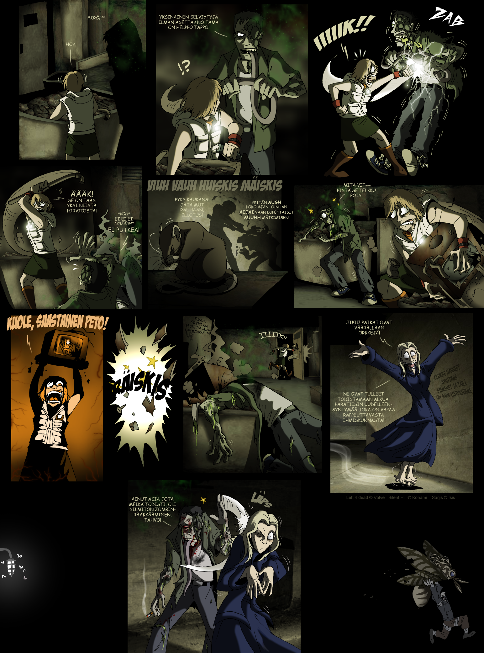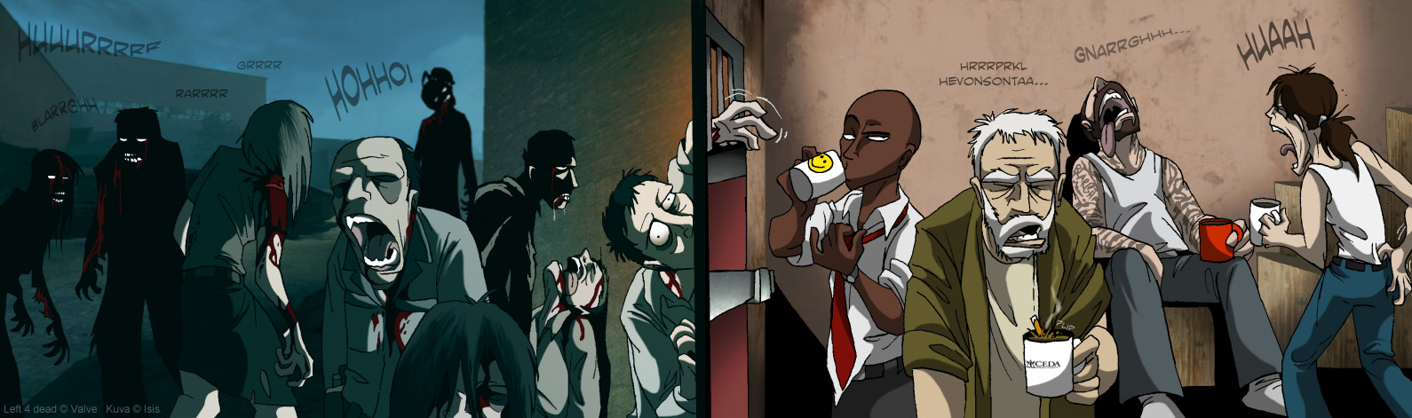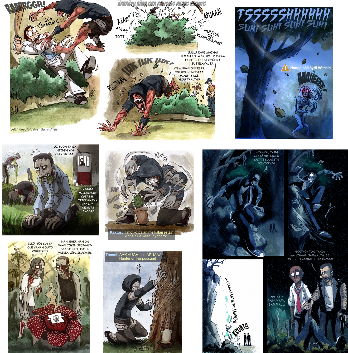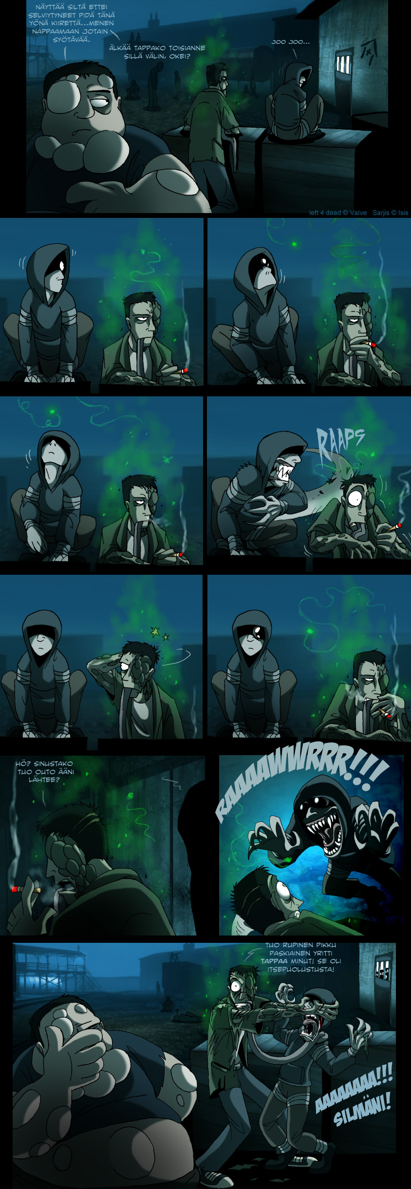 Näiden pilasarjakuvien aiheena on Valven julkaisema Left 4 Dead, ensimmäisen persoonan ammunta- ja selviytymiskauhupeli. Pelissä on 2 vastakkaista tiimiä, ihmis-selviytyjät ja zombimaiset saastuneet. Sarjakuvissa on paljon väkivaltaa ja kiroilua.