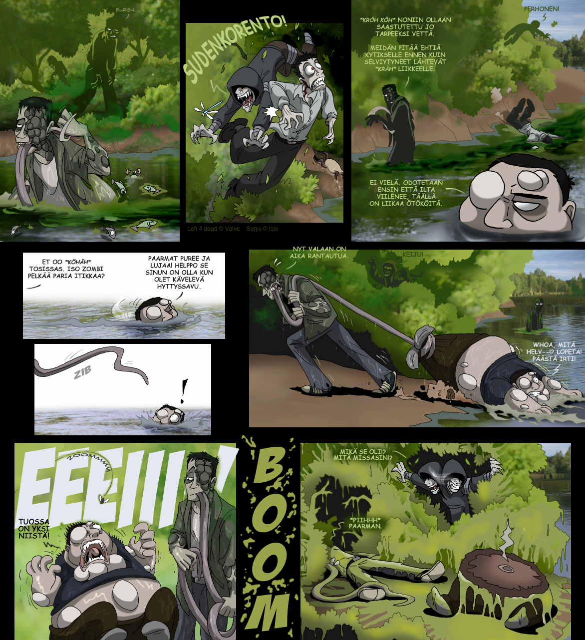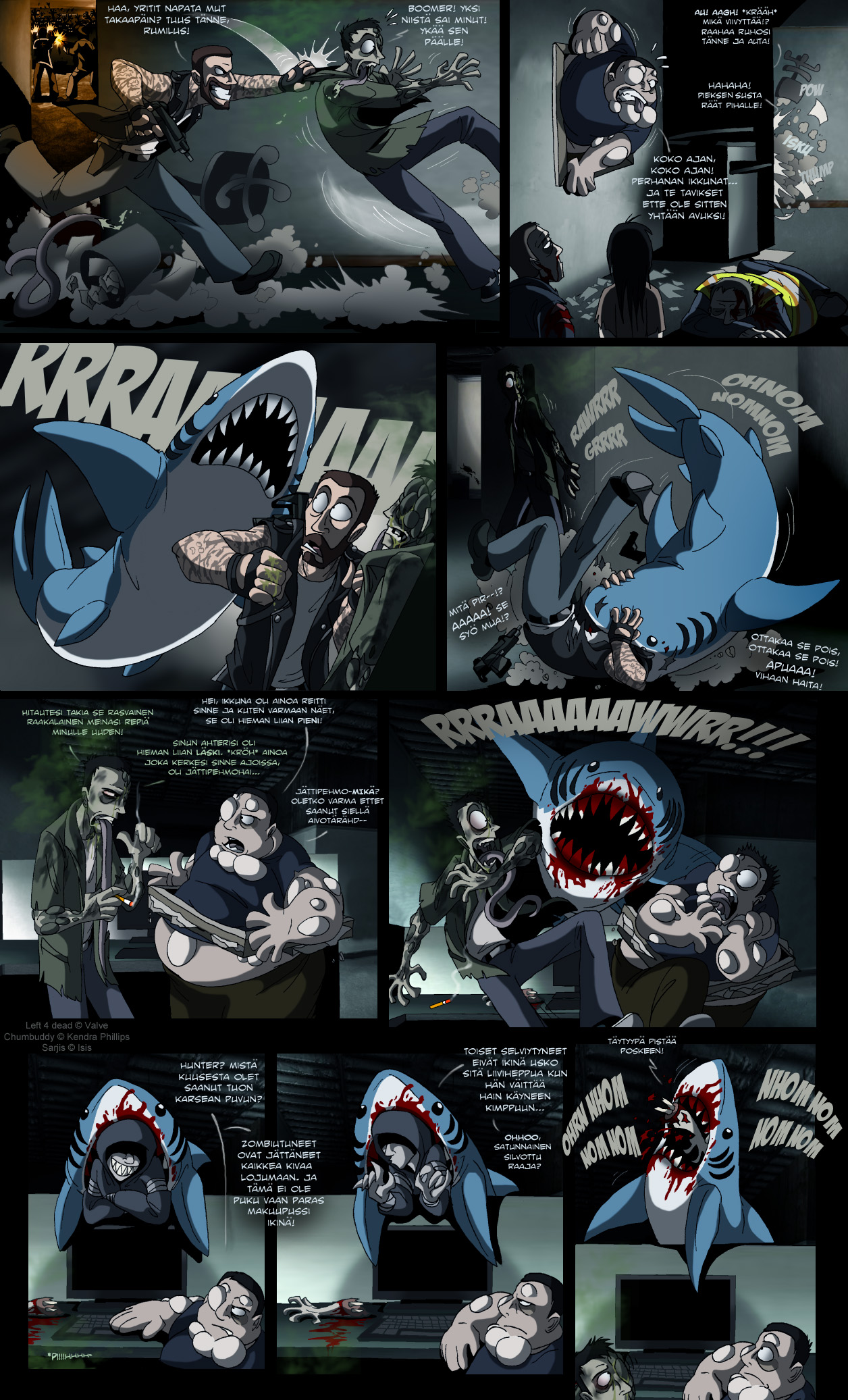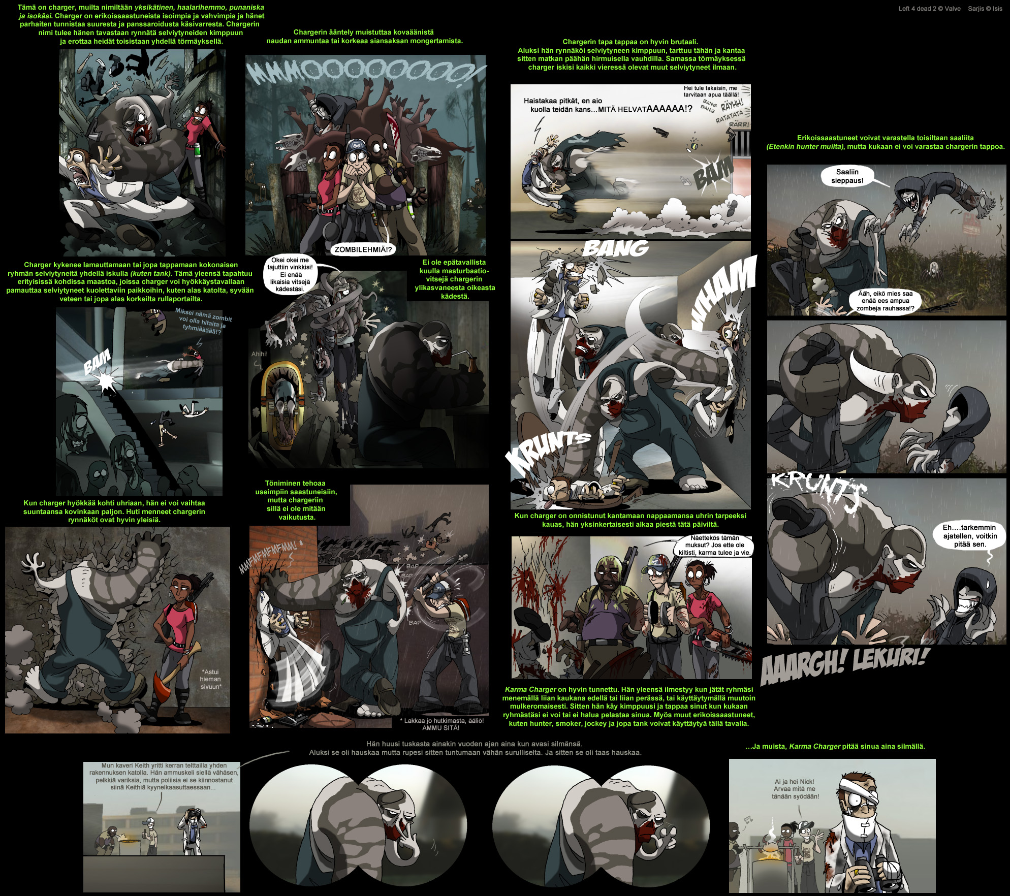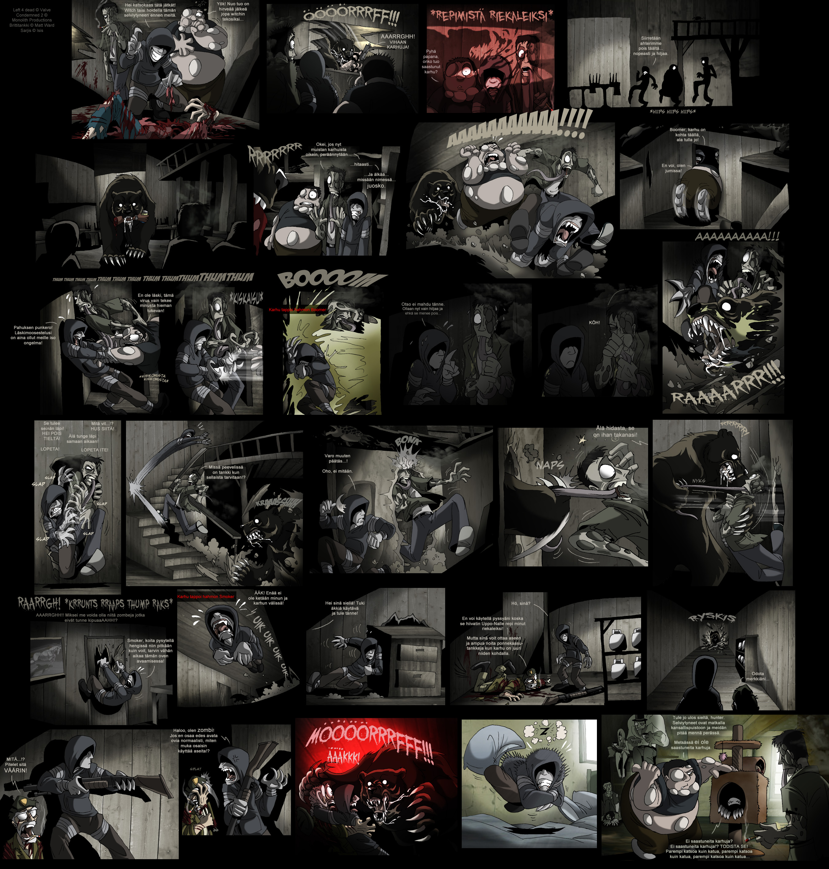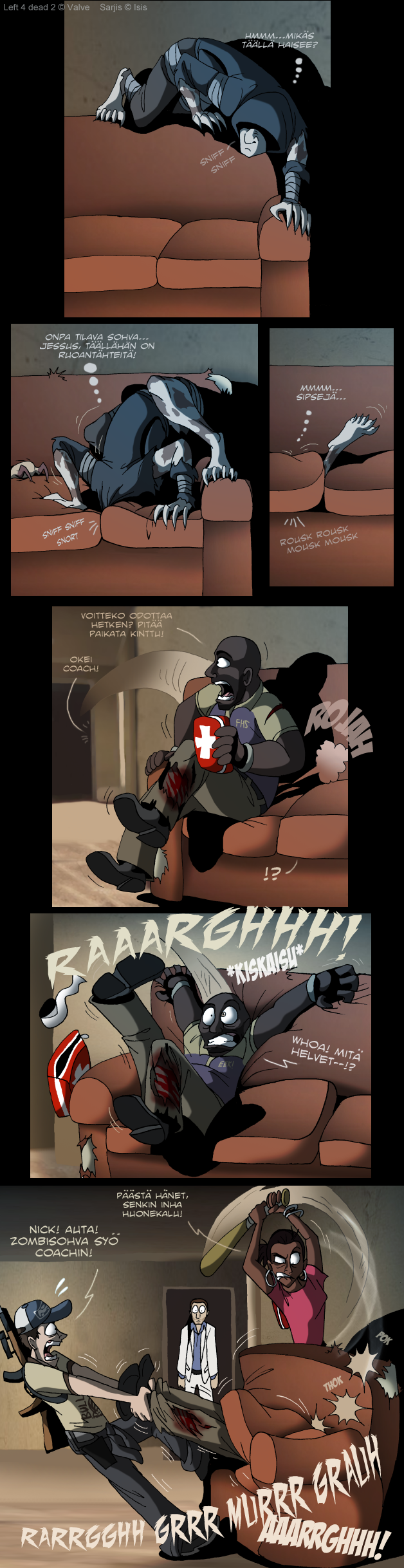 Näiden pilasarjakuvien aiheena on Valven julkaisema Left 4 Dead, ensimmäisen persoonan ammunta- ja selviytymiskauhupeli. Pelissä on 2 vastakkaista tiimiä, ihmis-selviytyjät ja zombimaiset saastuneet. Sarjakuvissa on paljon väkivaltaa ja kiroilua.