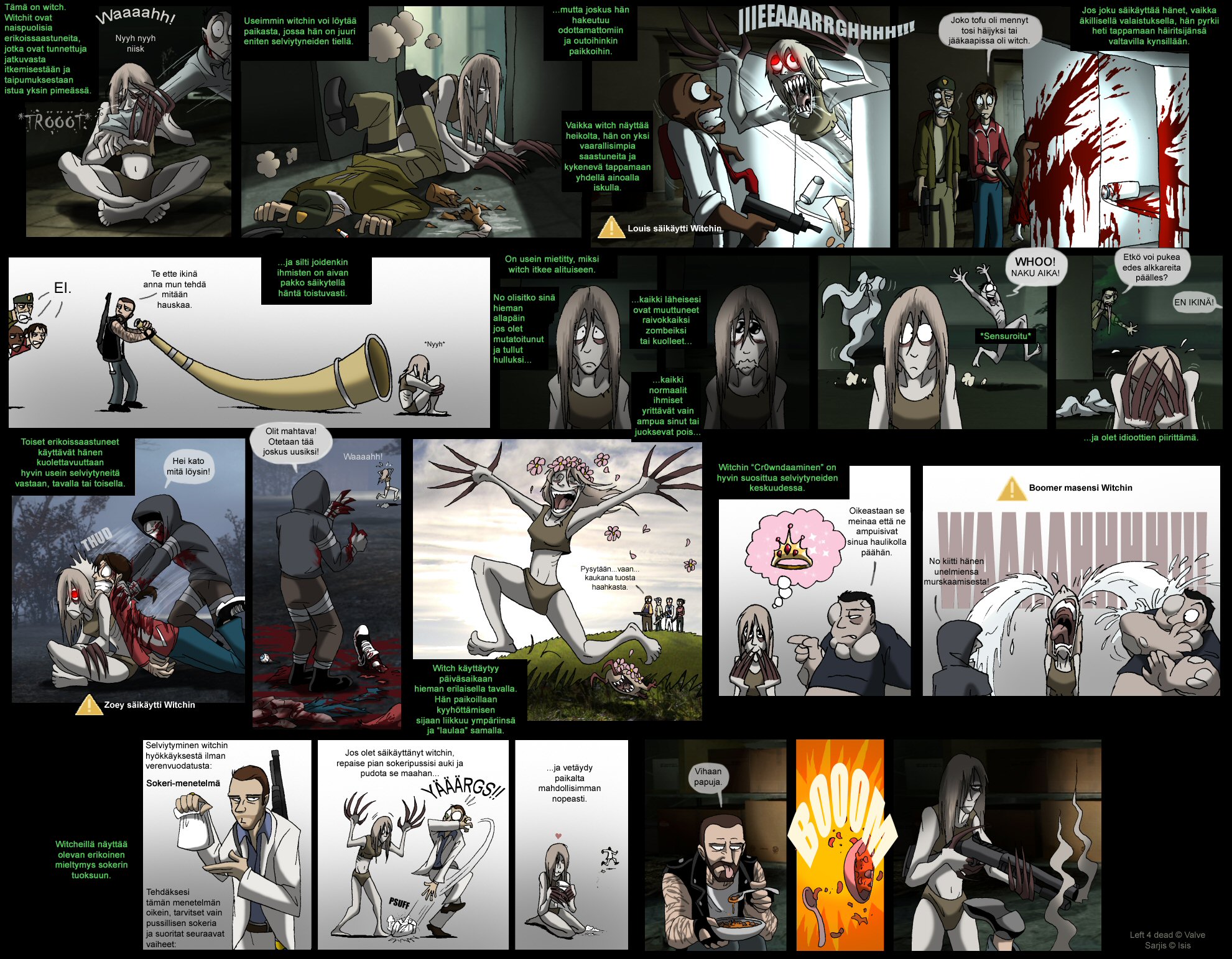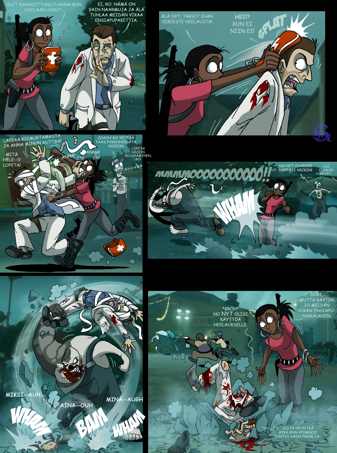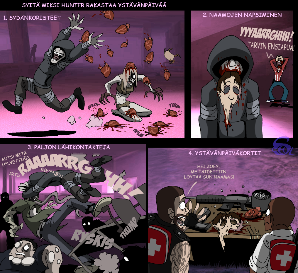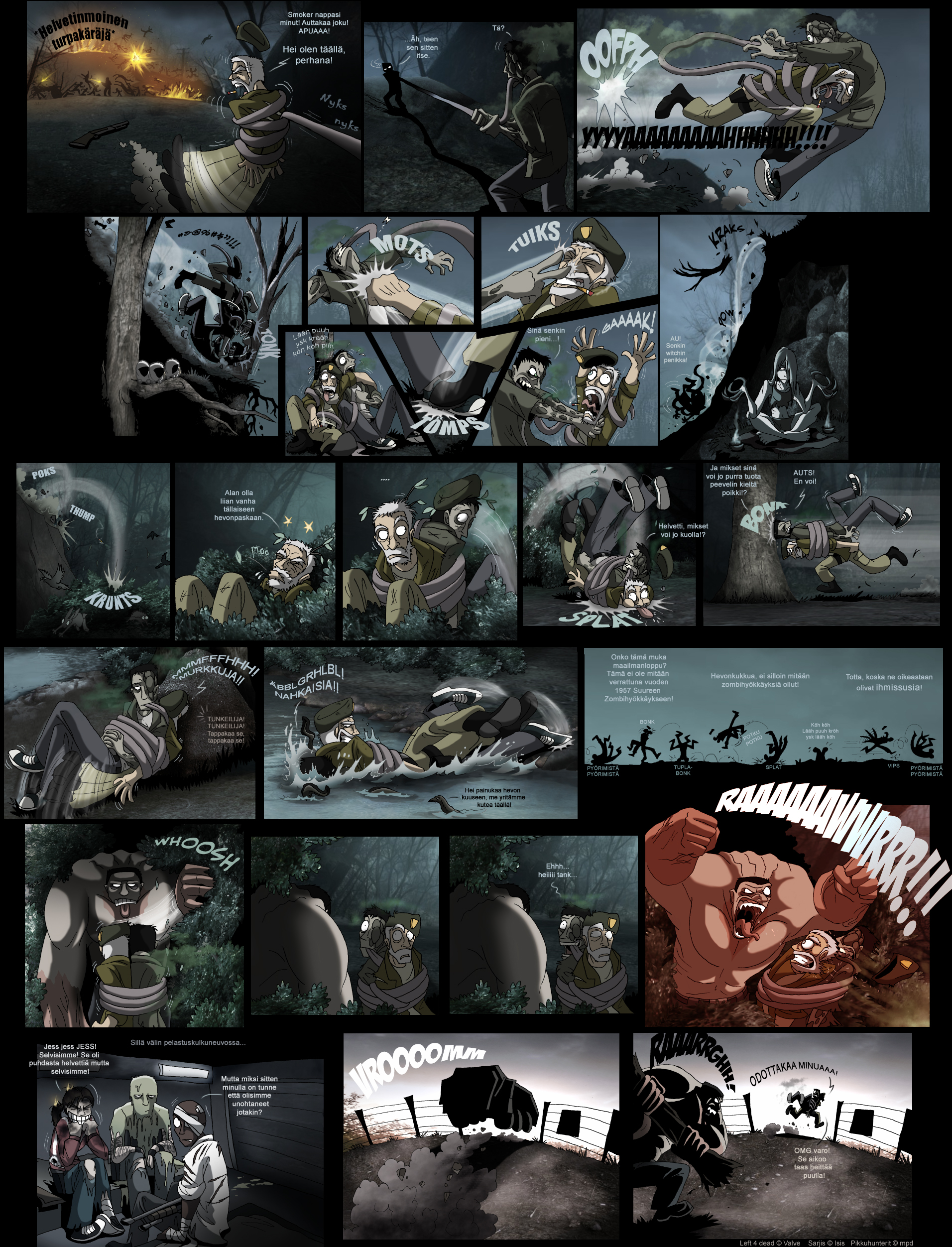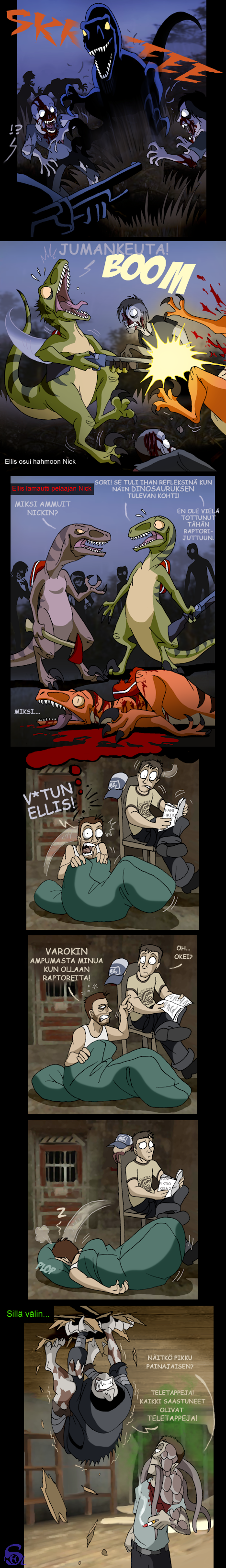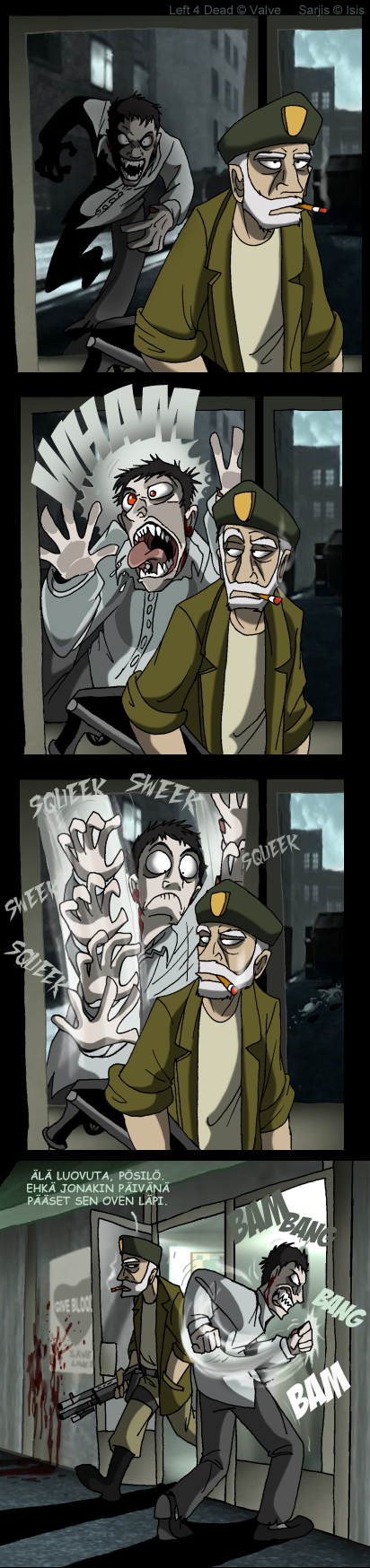 Näiden pilasarjakuvien aiheena on Valven julkaisema Left 4 Dead, ensimmäisen persoonan ammunta- ja selviytymiskauhupeli. Pelissä on 2 vastakkaista tiimiä, ihmis-selviytyjät ja zombimaiset saastuneet. Sarjakuvissa on paljon väkivaltaa ja kiroilua.