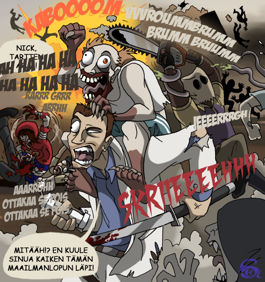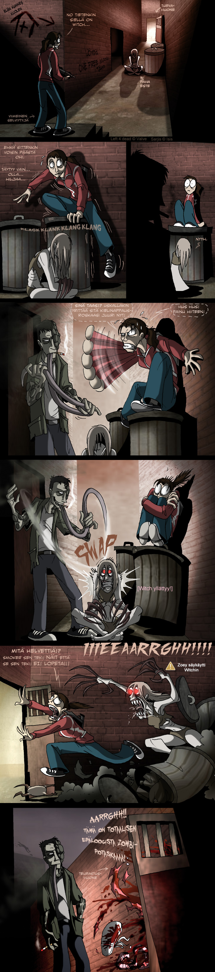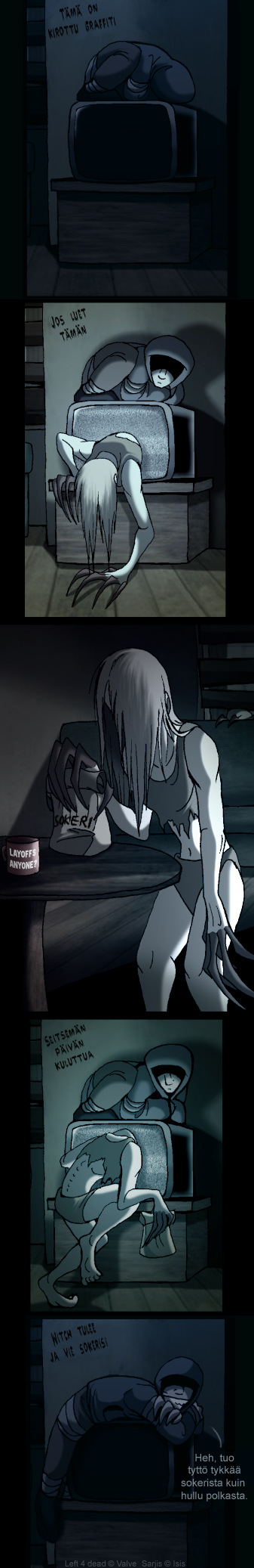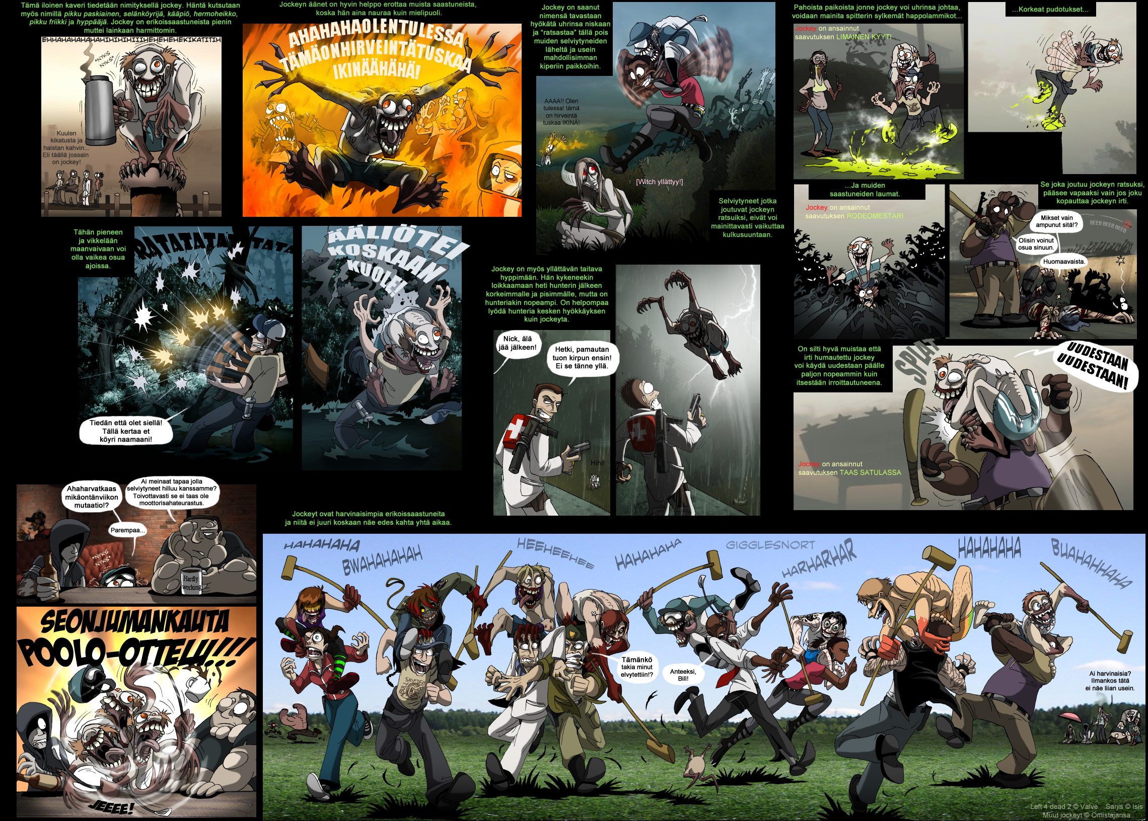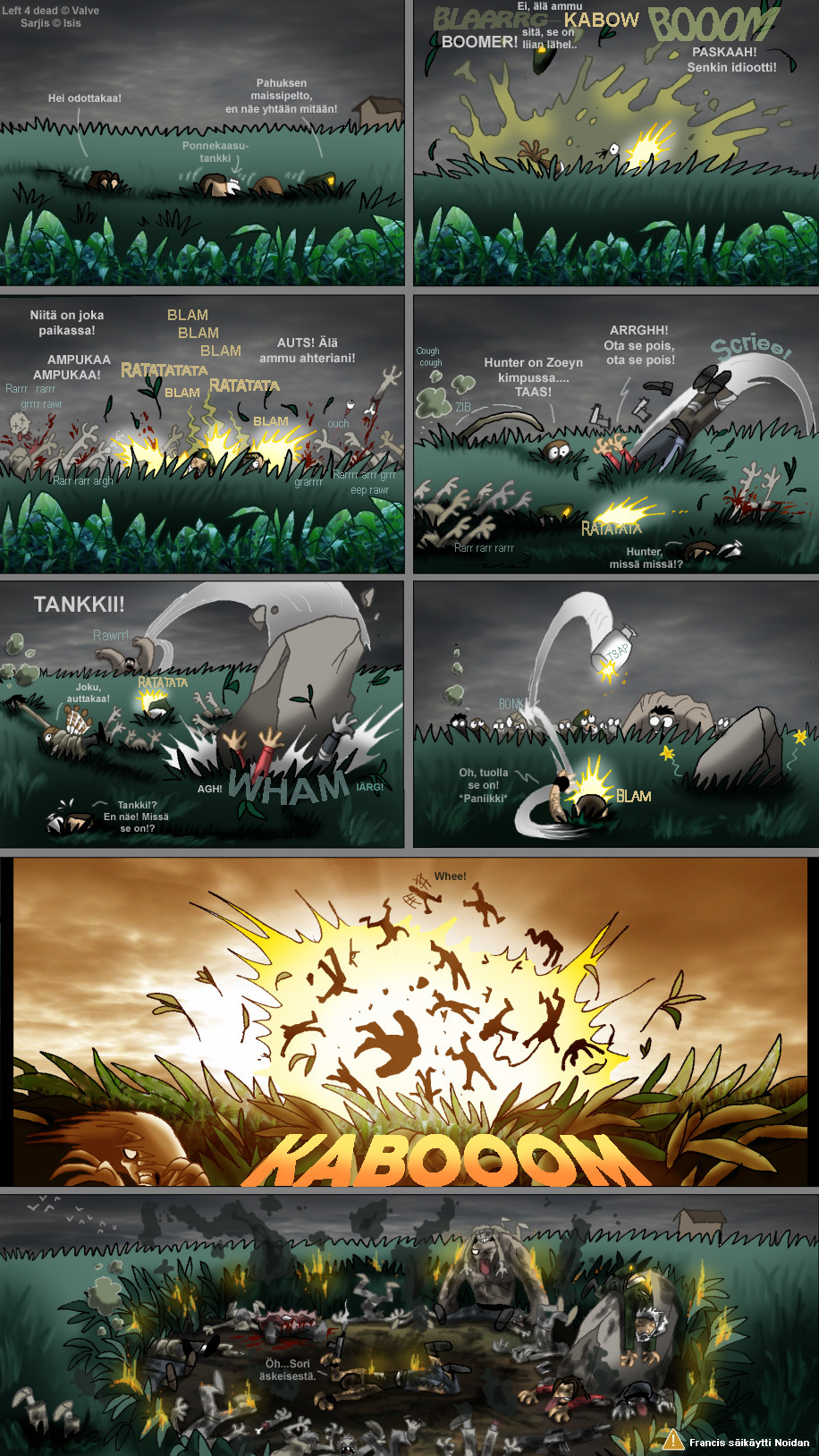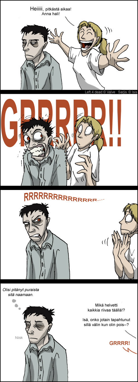 Näiden pilasarjakuvien aiheena on Valven julkaisema Left 4 Dead, ensimmäisen persoonan ammunta- ja selviytymiskauhupeli. Pelissä on 2 vastakkaista tiimiä, ihmis-selviytyjät ja zombimaiset saastuneet. Sarjakuvissa on paljon väkivaltaa ja kiroilua.