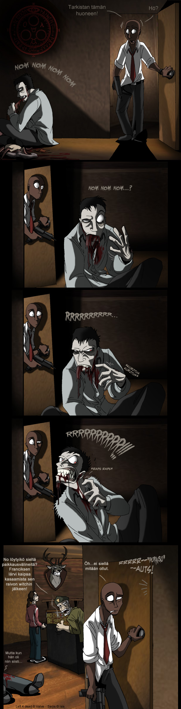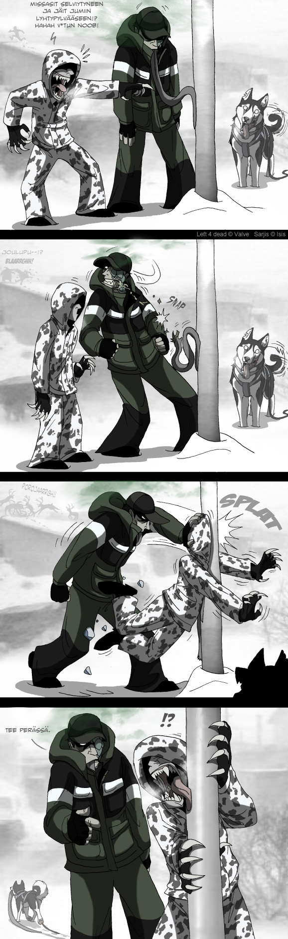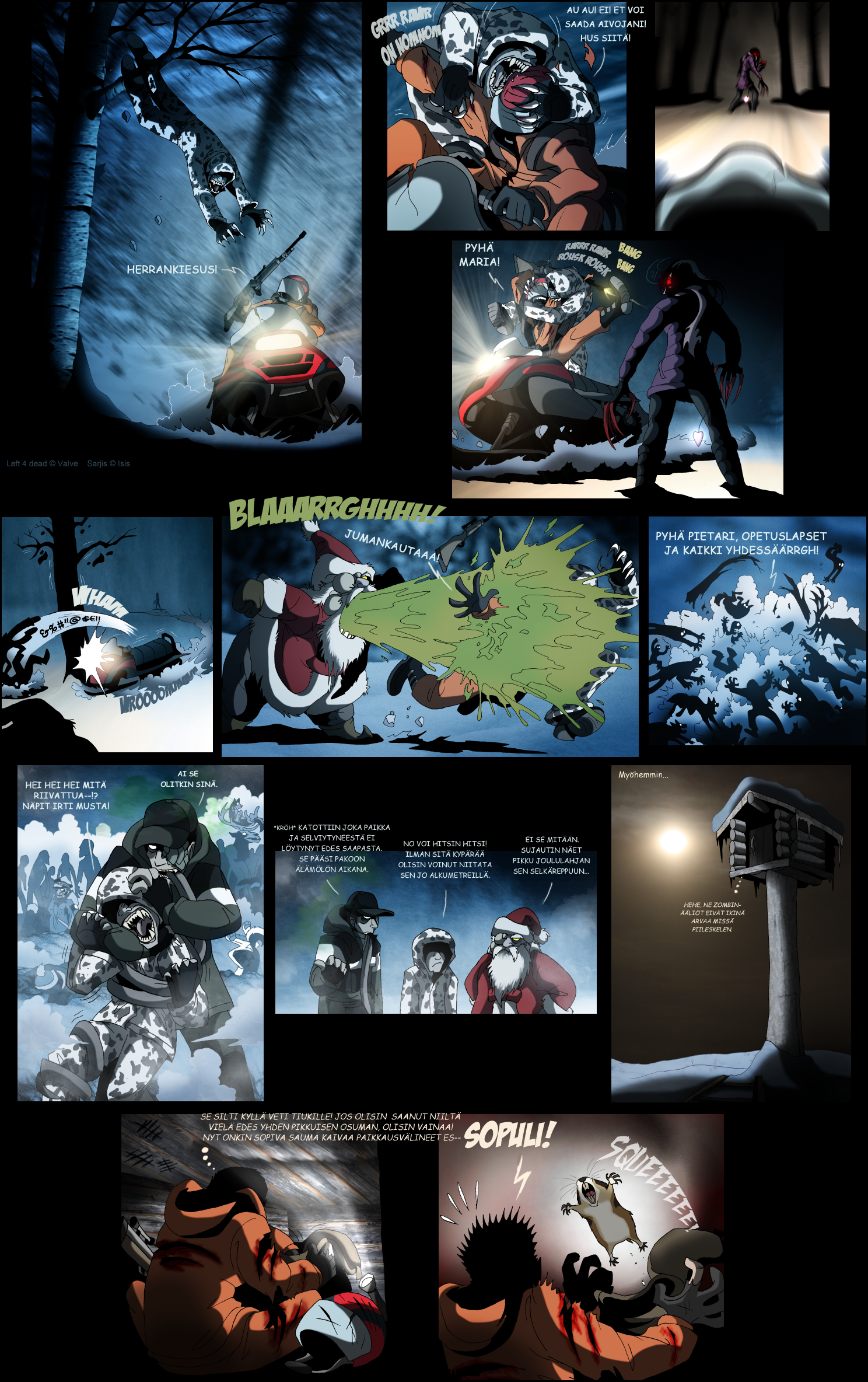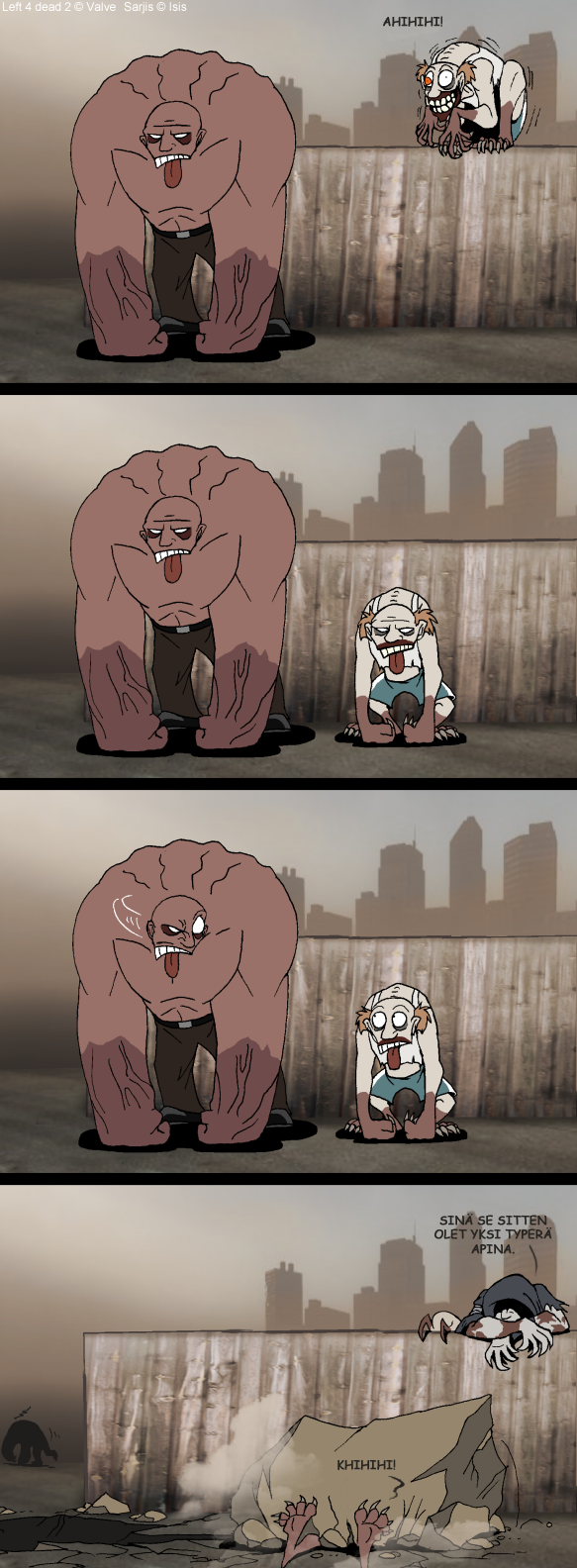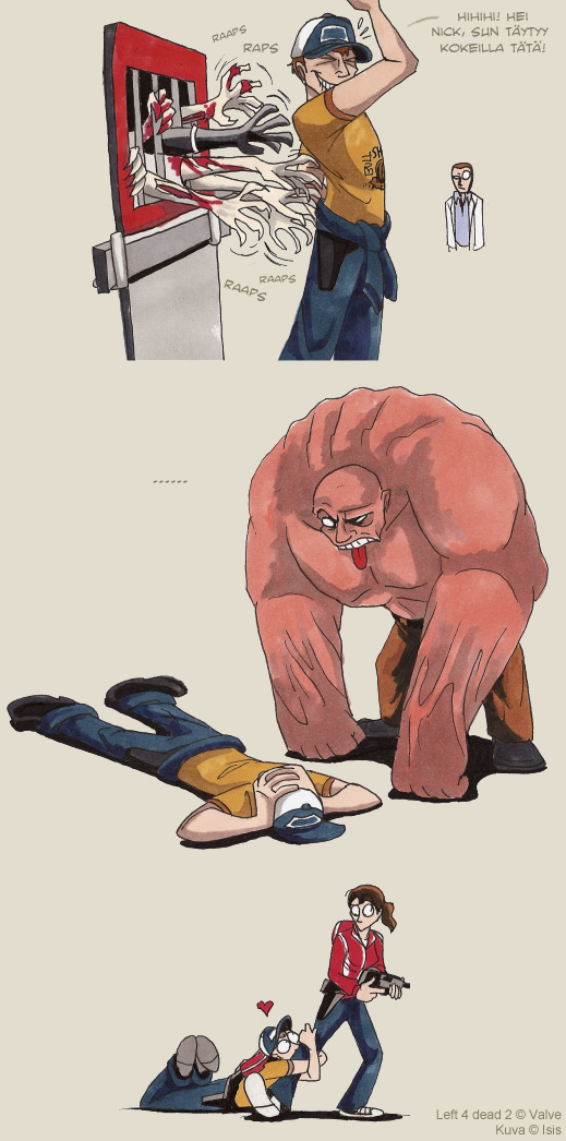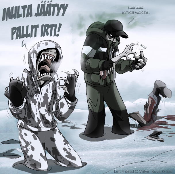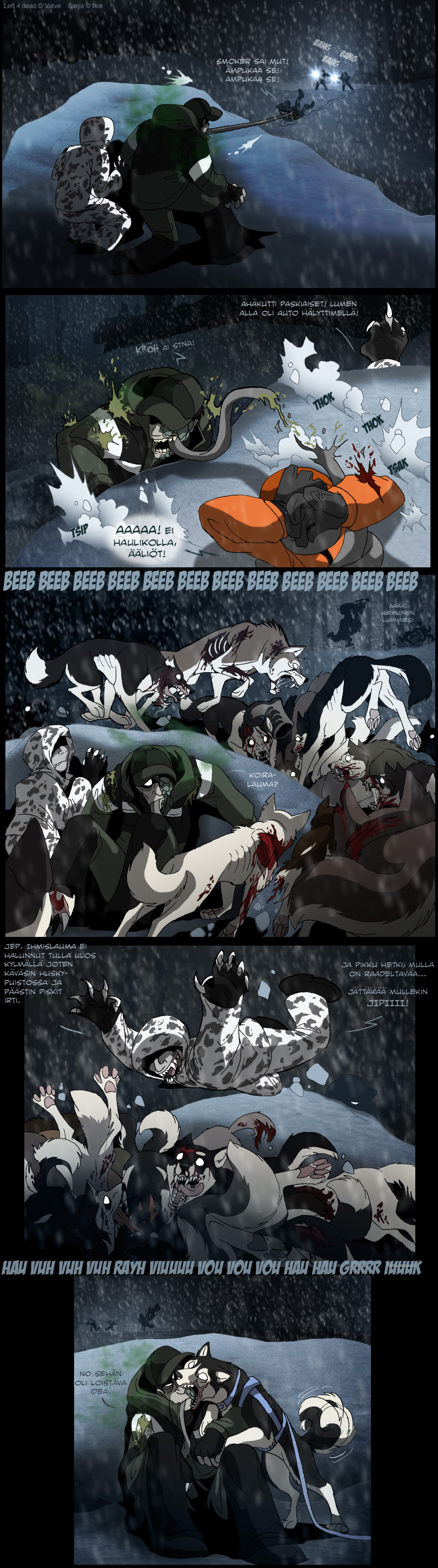 Näiden pilasarjakuvien aiheena on Valven julkaisema Left 4 Dead, ensimmäisen persoonan ammunta- ja selviytymiskauhupeli. Pelissä on 2 vastakkaista tiimiä, ihmis-selviytyjät ja zombimaiset saastuneet. Sarjakuvissa on paljon väkivaltaa ja kiroilua.