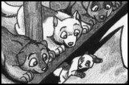 Vasemmanpuoleisin on Petra, joka toimii kyläkoirien saluunanpitäjänä. Hänen rakas miehensä Välkky on kylän kolmas lähetti ja heillä on kolme pentua: Mamba (valkoinen), Crich (Välkyn värinen) ja Rii (tummin).