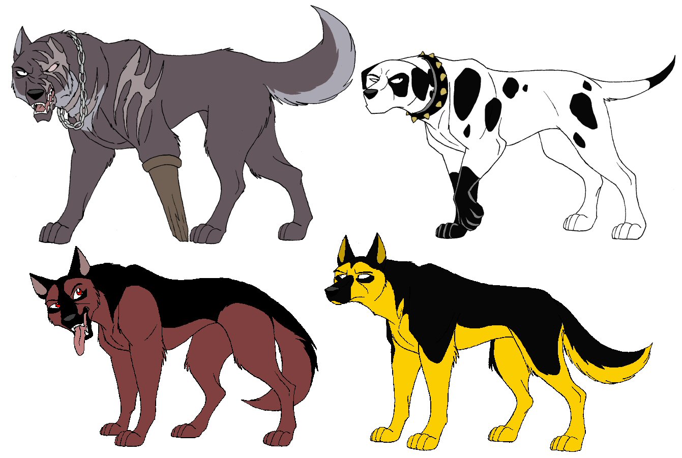 Villikoirat: Tavallisia tai vähemmän tavallisia koiria, jotka elävät laumoissa. Joko ovat syntyneet villeinä tai sitten ovat joskus lähteneet ihmisten luota. Jotkut laumat ovat asettuneet ihmisten hylkäämille rakennusalueille asumaan ja osaavat jopa käyttää ihmisten aseita, ajaa joitakin ajoneuvoja ja tehdä tulta. Tässä tarinassa on kolme läheistä koiraklaania, jotka pitävät yhteyttä toisiinsa ja ovat yhteistyössä keskenään. (kyläkoirat, satamakoirat ja temppelikoirat). Koirien inspiraationa ovat olleet piirretyt Kaikenkarvainen Charlie, Balto ja anime Hopeanuoli.