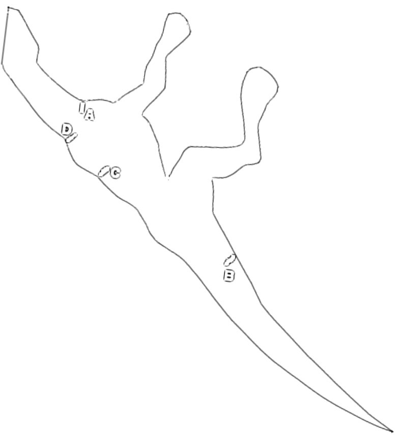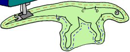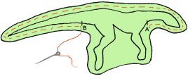 Seuraavaksi ompelet vartalokappaleet ja vatsan yhteen ääriviivoja pitkin. NYT ERITYISTÄ TARKKUUTTA JOS KÄYTÄT OMPELUKONETTA. Ensin ompelet A:sta D:n, jätät D:n ja C:n väliin kääntö-ja täyttöaukon, sitten C:stä B:n ja lopuksi vatsakappaleen eri puolet yhteen vartalokappaleiden kanssa B:stä A:n asti. Ompelun päätyttyä voit poistaa harsinlangat: