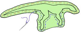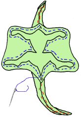 Sitten ompelet viivoja pitkin niin että siipien eri puolet yhdistyvät näissä kohden. Tämä kohta auttaa siipiä pysymään muodossaan ja luo yksityiskohtaisuutta pehmoon: