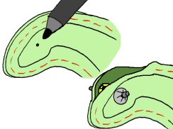 3. SILMIEN KIINNITYS: Jo tässä vaiheessa kannattaa kiinnittää silmät. Ota tussi jonka jälki voi mennä kankaan lävitse ja tökkää vartalokappaleen pään kohdille piste johon haluat silmän sijoittuvan. Leikkaa harsintalankaa auki päälaelta sen verran että saisit silmät asetettua paikoilleen. Pistä vaikka harpin piikillä pisteiden kohdille reiät ja aseta silmät paikoilleen niin että silmät ovat nyt SISÄPUOLELLA. Alla oleva kuva havainnoillistaa: