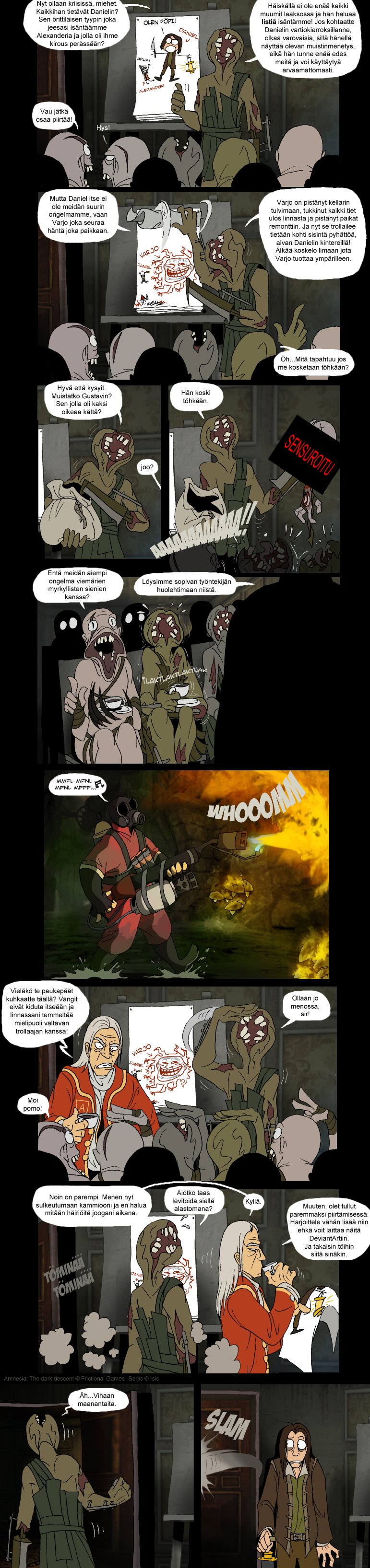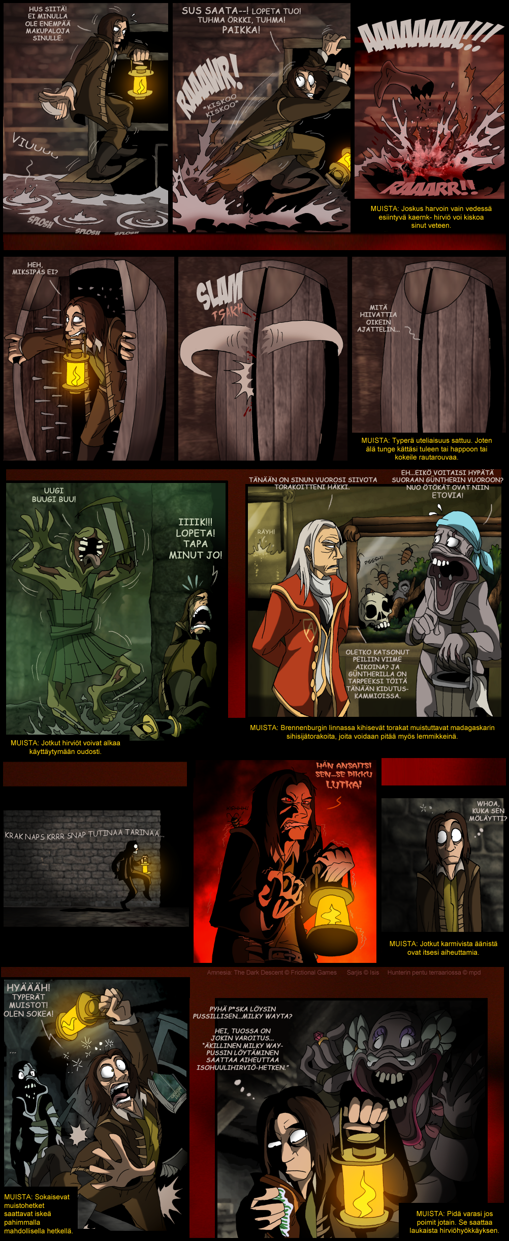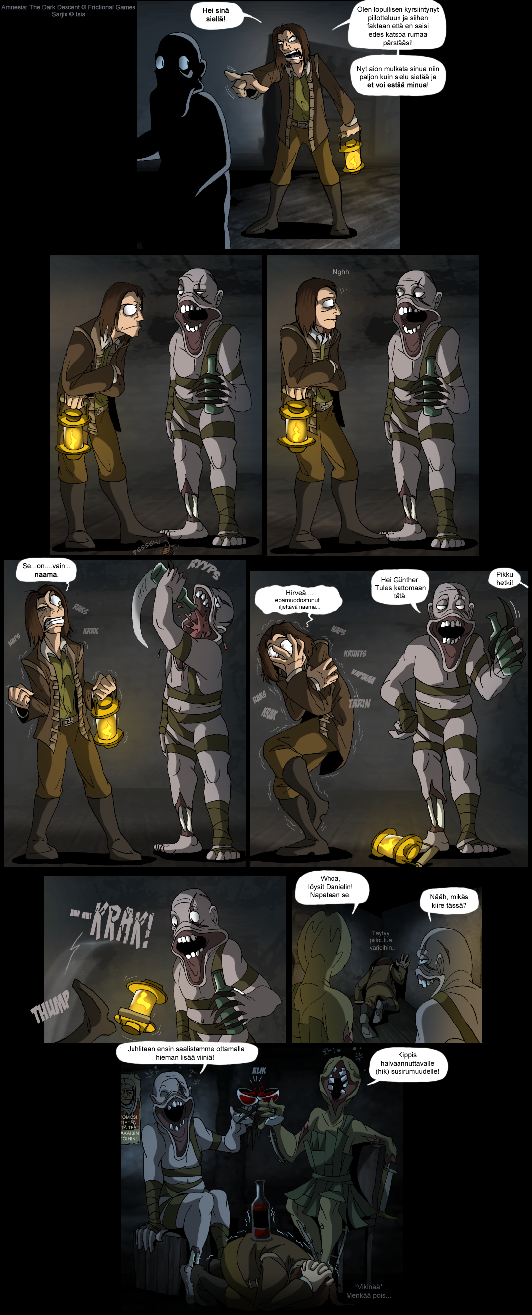 Parodiaa Frictional Gamesin luomasta selviytymiskauhupelistä Amnesia. Useimmat sarjakuvista perustuvat omiin kokemuksiini pelissä.