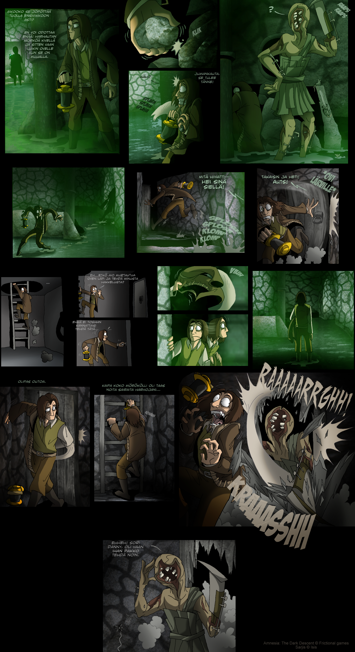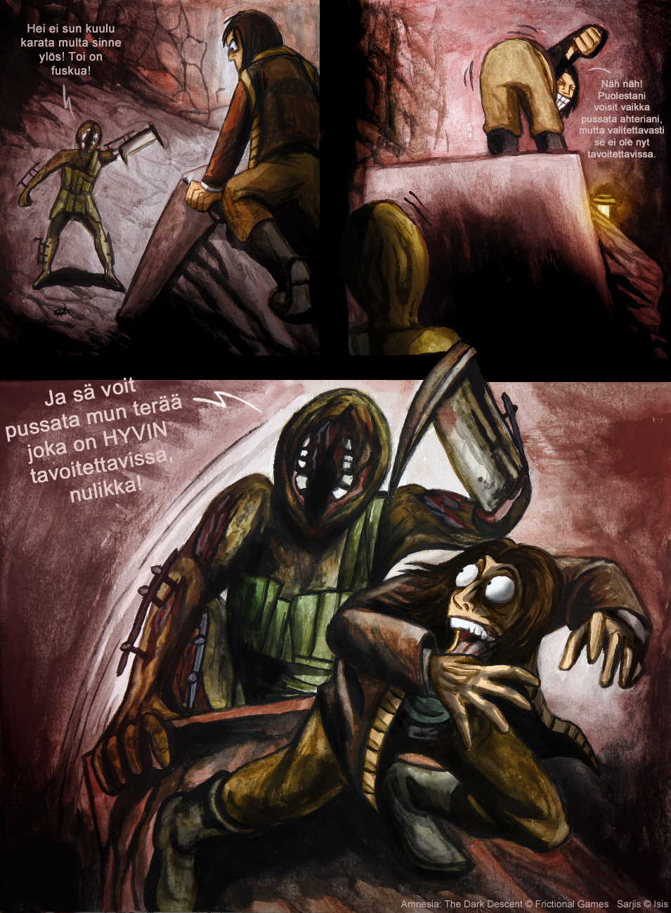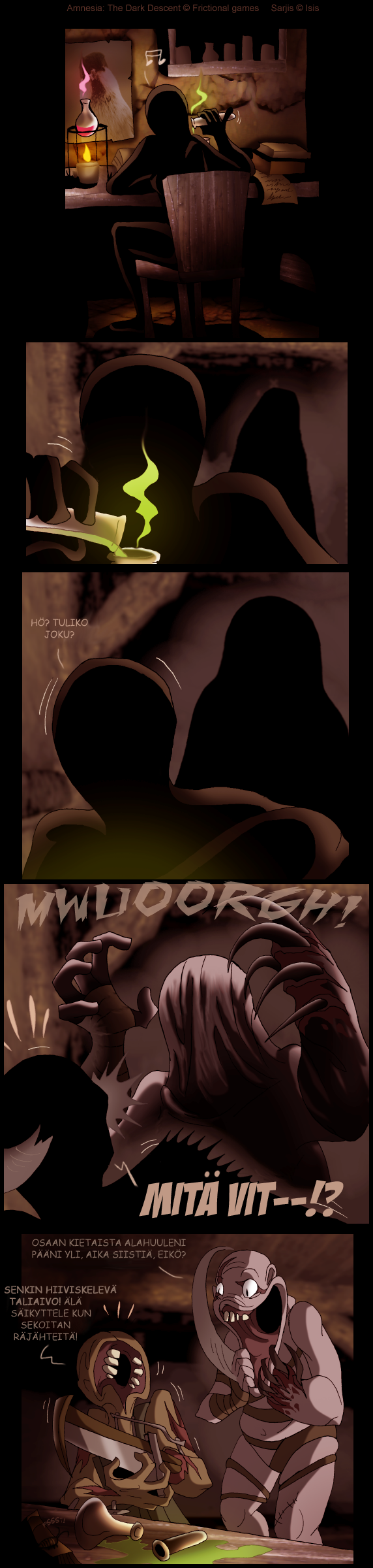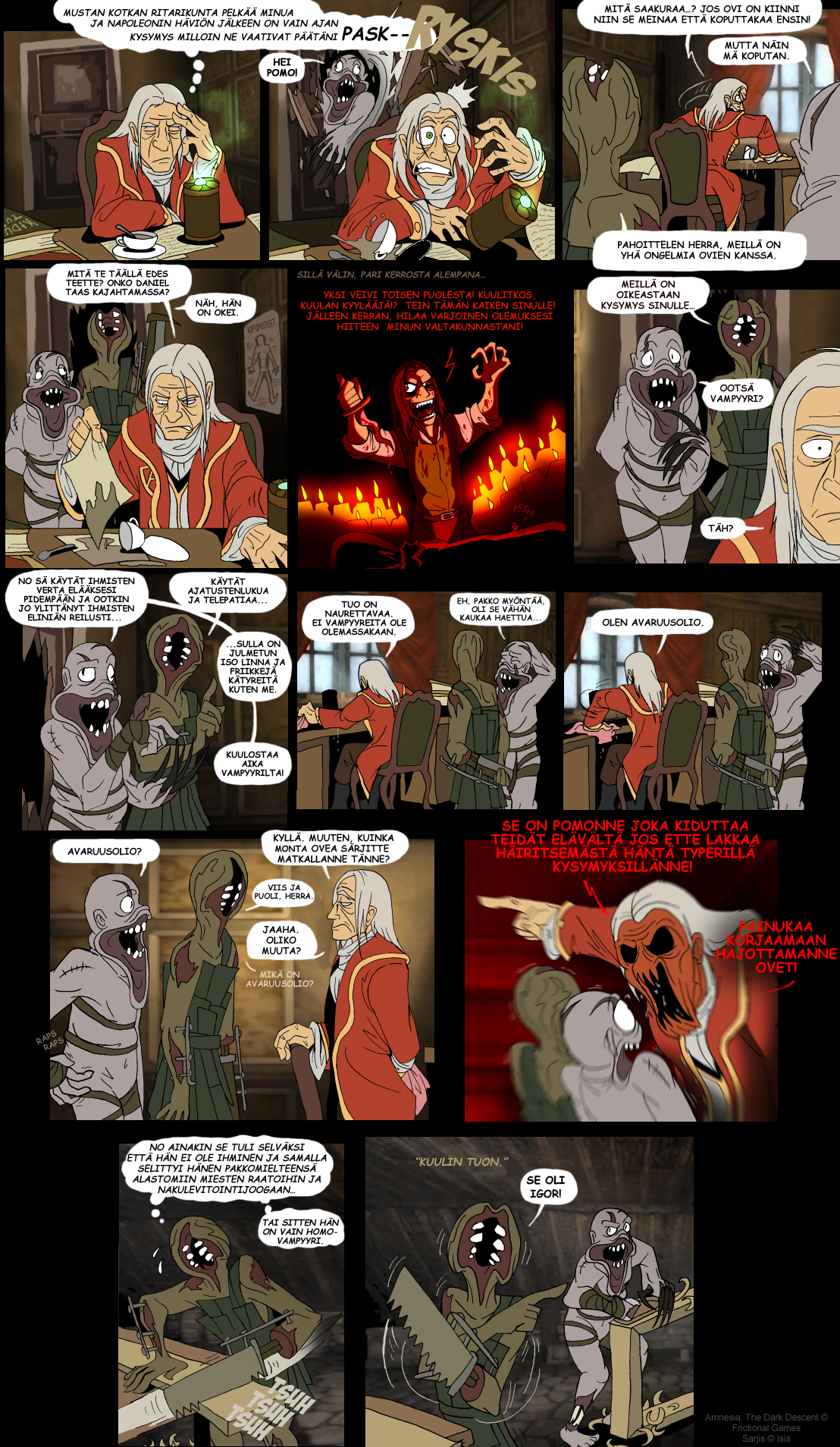 Parodiaa Frictional Gamesin luomasta selviytymiskauhupelistä Amnesia. Useimmat sarjakuvista perustuvat omiin kokemuksiini pelissä.