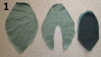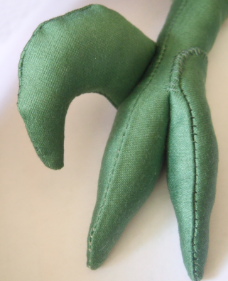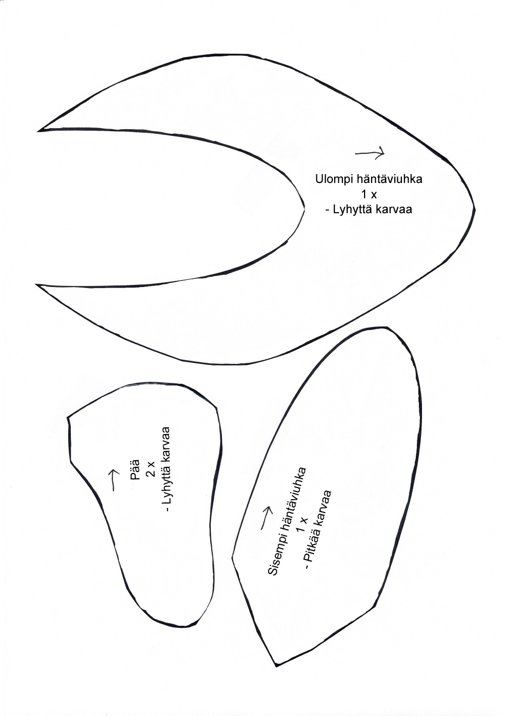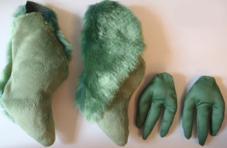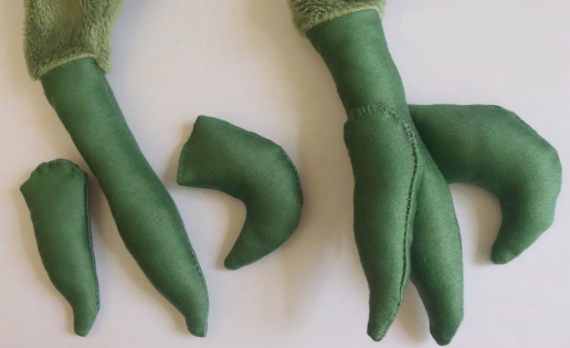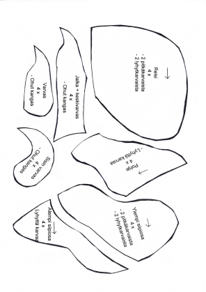 Tältä ommellut pehmon osat näyttäisivät kun ne ovat käännetty oikein päin ja ennen raajojen kiinniompelua vartaloon. Varpaat ja kädet ovat vielä kuvassa kääntämättä oikein päin.