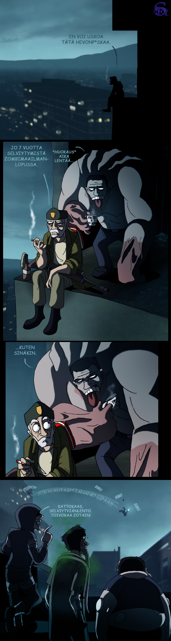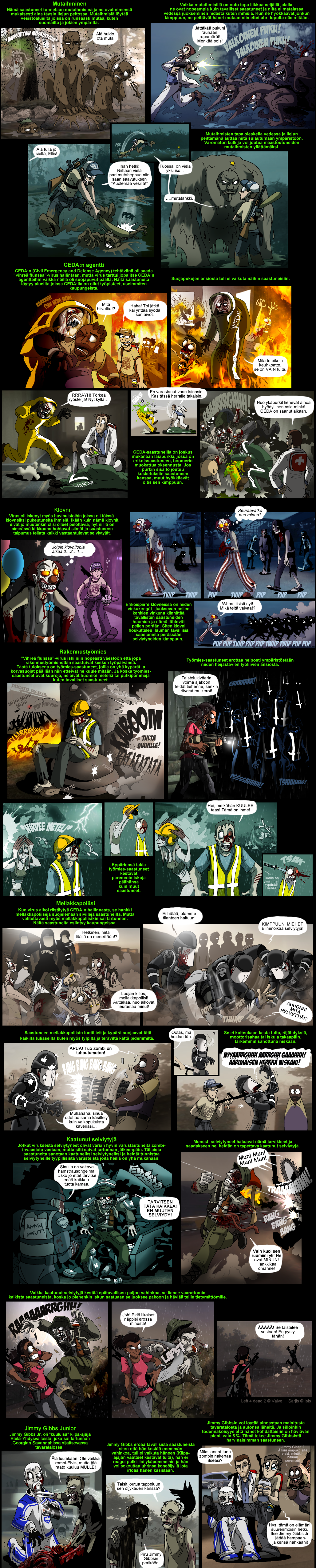 Näiden pilasarjakuvien aiheena on Valven julkaisema Left 4 Dead, ensimmäisen persoonan ammunta- ja selviytymiskauhupeli. Pelissä on 2 vastakkaista tiimiä, ihmis-selviytyjät ja zombimaiset saastuneet. Sarjakuvissa on paljon väkivaltaa ja kiroilua.