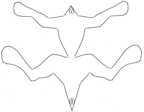 1. NUPPINEULAT: Asettele kappaleet yhteen oikeat puolet vastakkain nuppineuloilla niin että vartalokappaleet tulevat ääriviivatarkkaan yhteen pisteisiin A:n ja B:n asti. Yhdistä nuppineuloilla seuraavaksi vatsakappale kummankin vartalokappaleen väliin niin että vatsakappaleen A-piste osuu yhteen vartalokappaleiden A-pisteen kanssa ja sama B-pisteillä. Tärkeää että raajatkin osuvat täysin yhteen. Tällaisen pitäisi nyt vartalokappaleiden näyttää sivustakatsottuina: