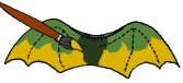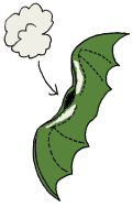 9. SIIPIEN KIINNITYS: Kun sekä vartalo että siivet ovat maalattuja ja täysin kuivuneita, voit ommella vartalon täyttöaukon kiinni ja sitten ommella siivet täyttöaukon päälle. Voit vielä maalata kangasväreillä ompeleiden päältä hävittääksesi ompelujäljet ja nyt lohikäärmeen poikanen on valmis.