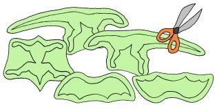 5. SAUMANVAROJEN LEIKKAAMINEN: Leikkaa liiat saumanvarat nyt pois, mutta ole tarkkana ettet vahingossa leikkaa vääristä kohdista. Sitä pienemmät ovat saumanvarat, sitä helpompaa on pehmon kääntäminen oikeinpäin. Tältä pitäisi nyt pehmon osat näyttää:
