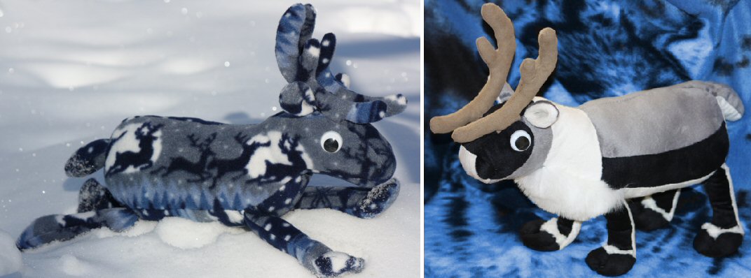 13. Käännä pehmo selkäaukon kautta oikein päin ja täytä se napakasti. Sulje lopuksi selän aukko ompelemalla. Poron sarvet voivat lerpottaa sivuille päin liikaa. Tämä korjaantuu kun ompelet sarvien sisäpuolen tyvet kiinni päälakeen.