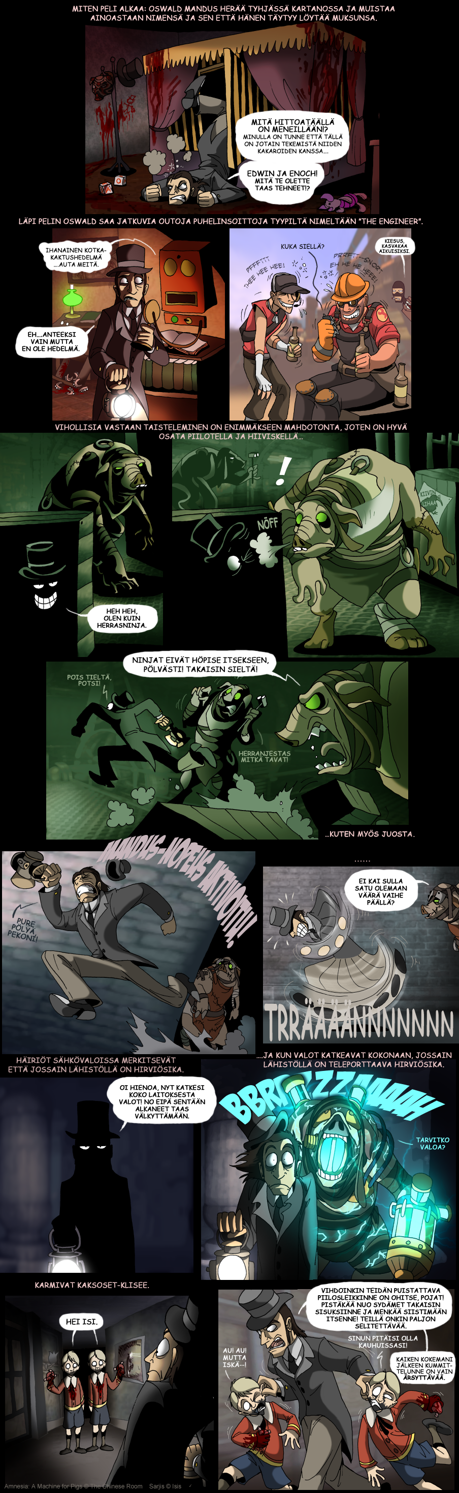 Parodiaa Frictional Gamesin luomasta selviytymiskauhupelistä Amnesia. Useimmat sarjakuvista perustuvat omiin kokemuksiini pelissä.